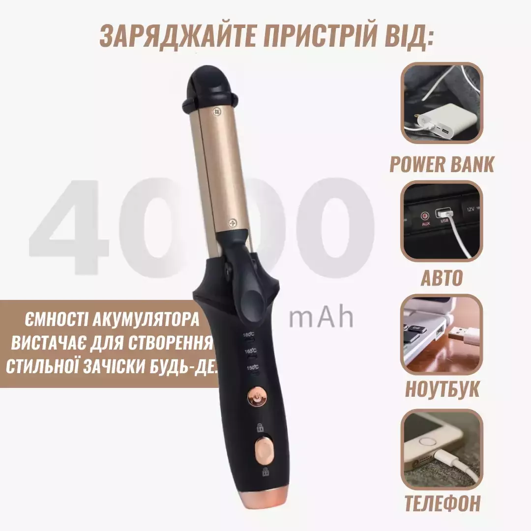 Встроенный аккумулятор 4000 мАч с USB-зарядкой: Заряжайте устройство от power bank, автомобильного зарядного устройства, компьютера или телефона. Емкости аккумулятора хватает для создания стильной прически в любом месте.