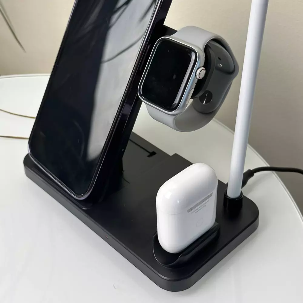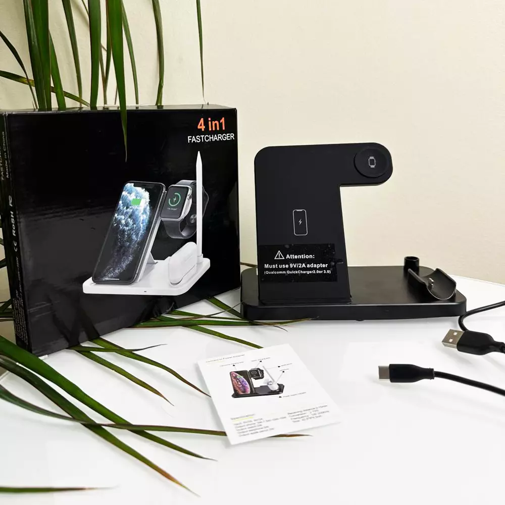 Беспроводное зарядное устройство W30 (4в1) - поможет сэкономить место на вашем рабочем месте или ночном столике, позволяя одновременно заряжать все ваши гаджеты. Вместо того, чтобы иметь дело с множеством кабелей и зарядных устройств, вы сможете подключить только один кабель к этой зарядной станции и с легкостью заряжать сразу 4 устройства. Это идеальное решение для тех, кто ценит порядок и комфорт в повседневной жизни. Кроме того, зарядка работает быстро и надежно, обеспечивая энергией ваши гаджеты в любое время. Благодаря компактному дизайну, зарядная станция легко впишется в интерьер любой комнаты или офиса, а ее возможности универсальны для современных устройств.