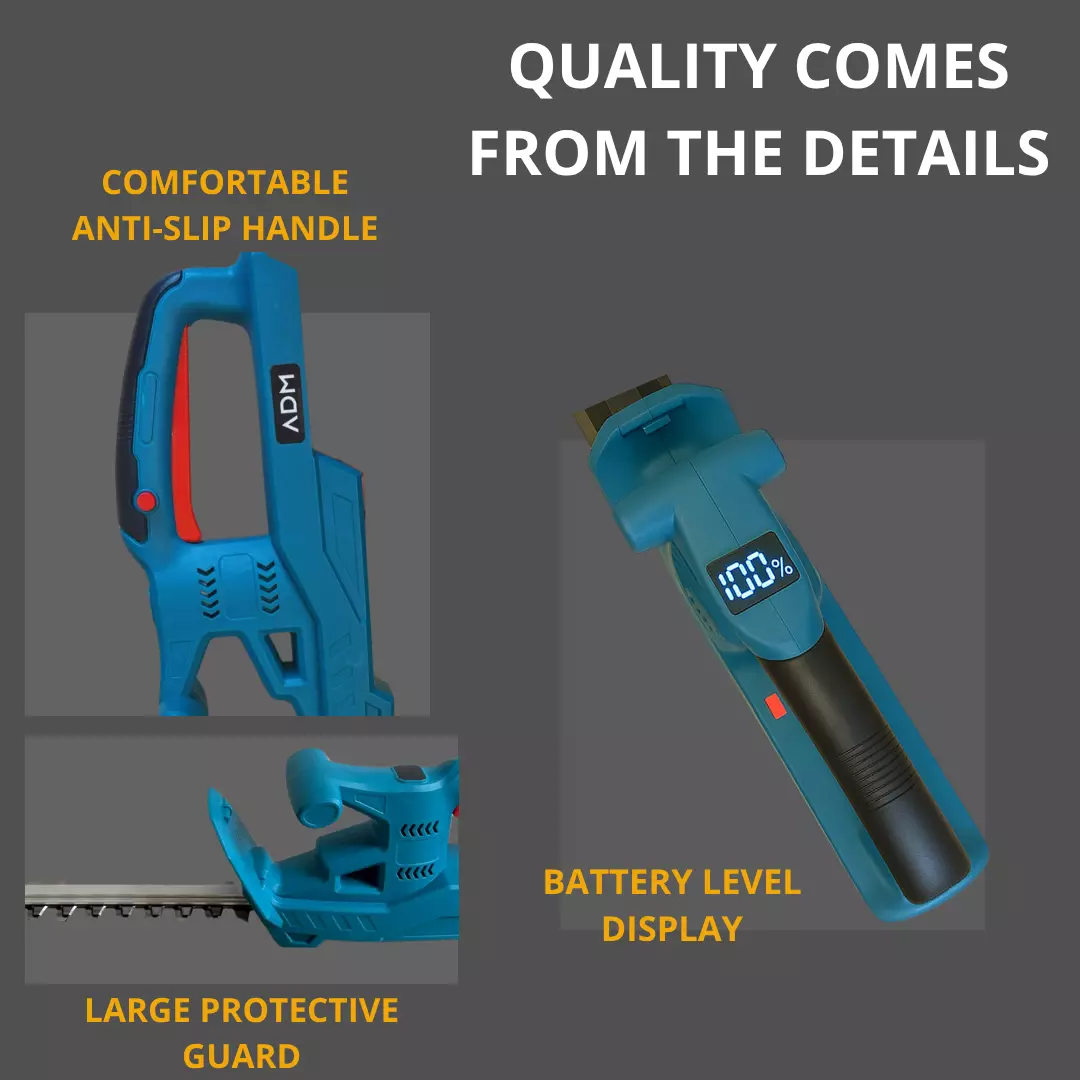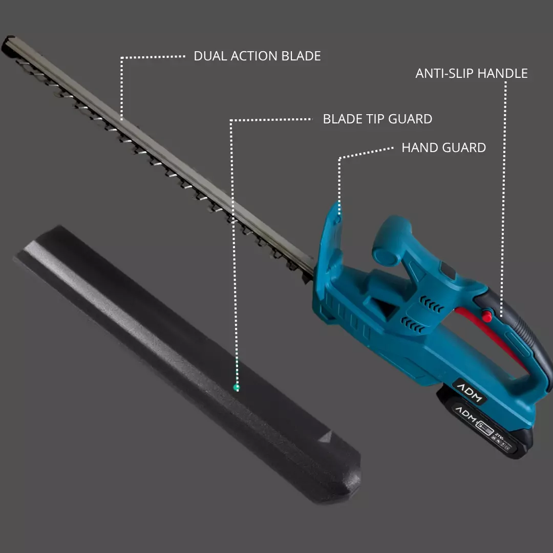 Розроблений для сучасного догляду за садом, бездротовий тример для живоплотів ADM з літієвим акумулятором 21 V забезпечує виняткову продуктивність з тихою та енергозберігаючою роботою. Його портативна конструкція, потужний двигун та зручність використання однією людиною роблять його розумним рішенням як для домашніх садів, так і для професійного ландшафтного дизайну. Ідеально підходить для точного обрізання, формування та догляду за живоплотами, кущами та чагарниками.