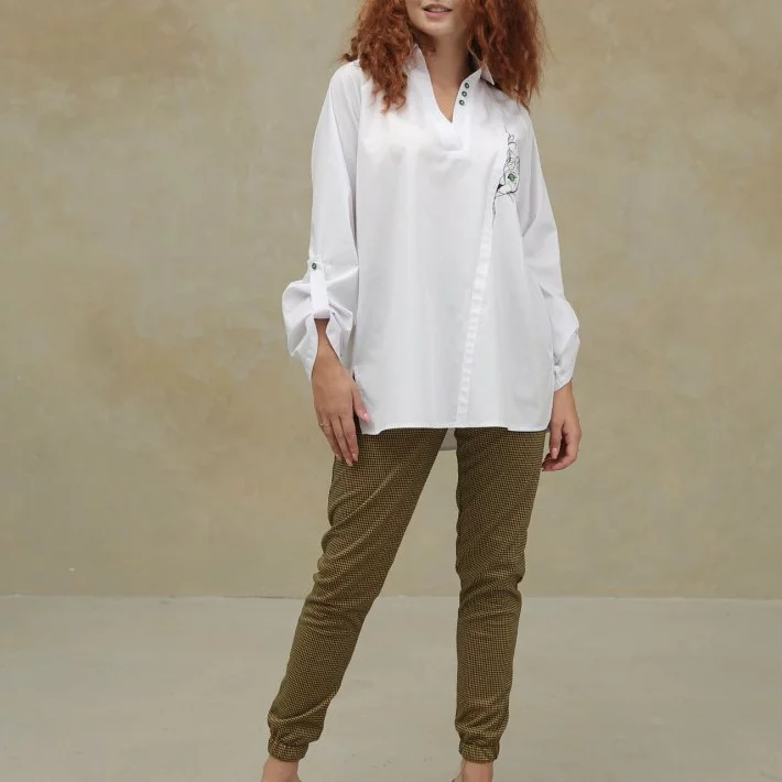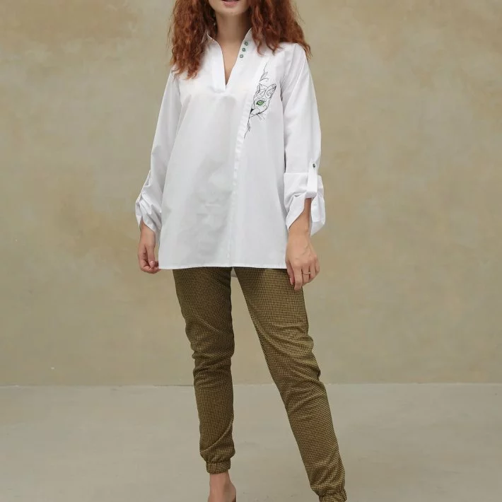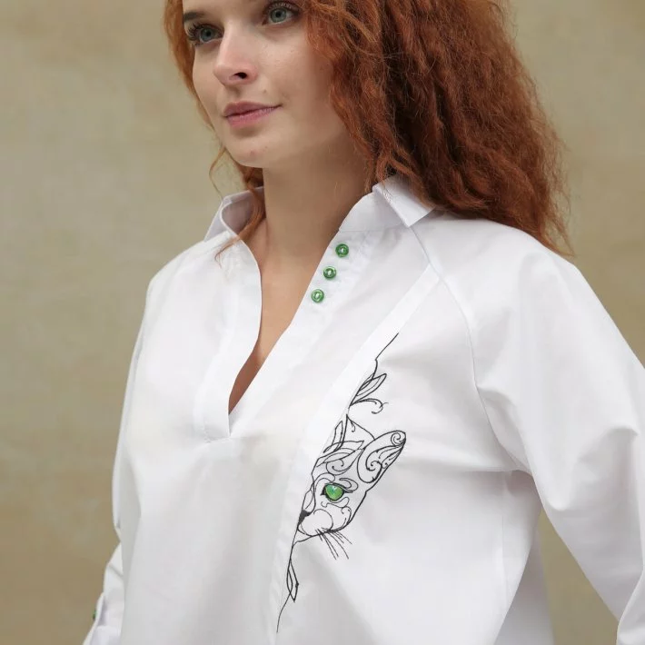 Блуза декорована гудзичками в тон кольору очей кота.