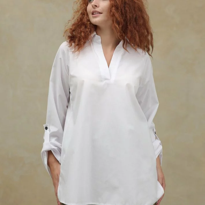 Біла блуза - туніка, трохи подовжена ззаду, з розрізами з боків.