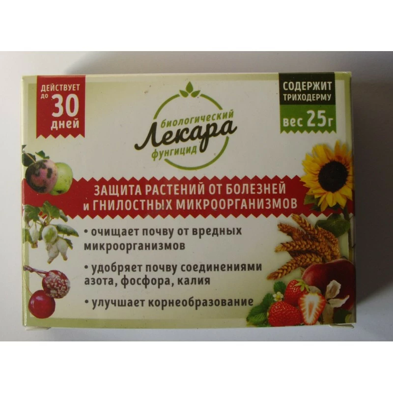 Биофунгицид "Лекара", содержит триходерму. Защищает растения от болезней и гнильных микроорганизмов, угнетая патогенную флору. Повышает иммунитет растений. Удобряет почву соединениями азота, фосфора, калия. Очищает почву от вредных микроорганизмов. Норма расхода - 25 г на 5-10 л воды.