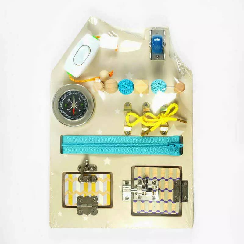 Бізіборд дерев`яний C 64871 (22) компас, шнурівка, змійка, замочки, колесо, перемикач, в коробці