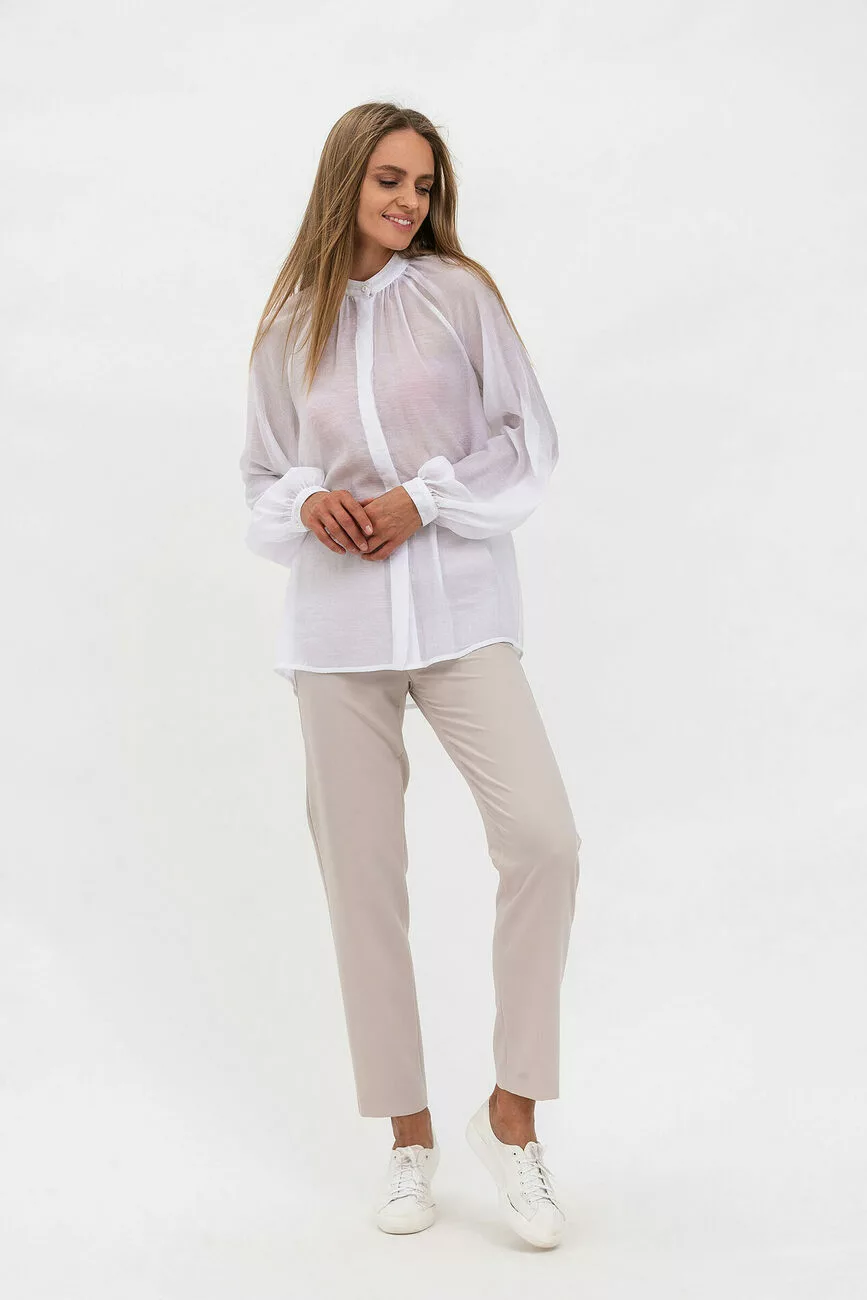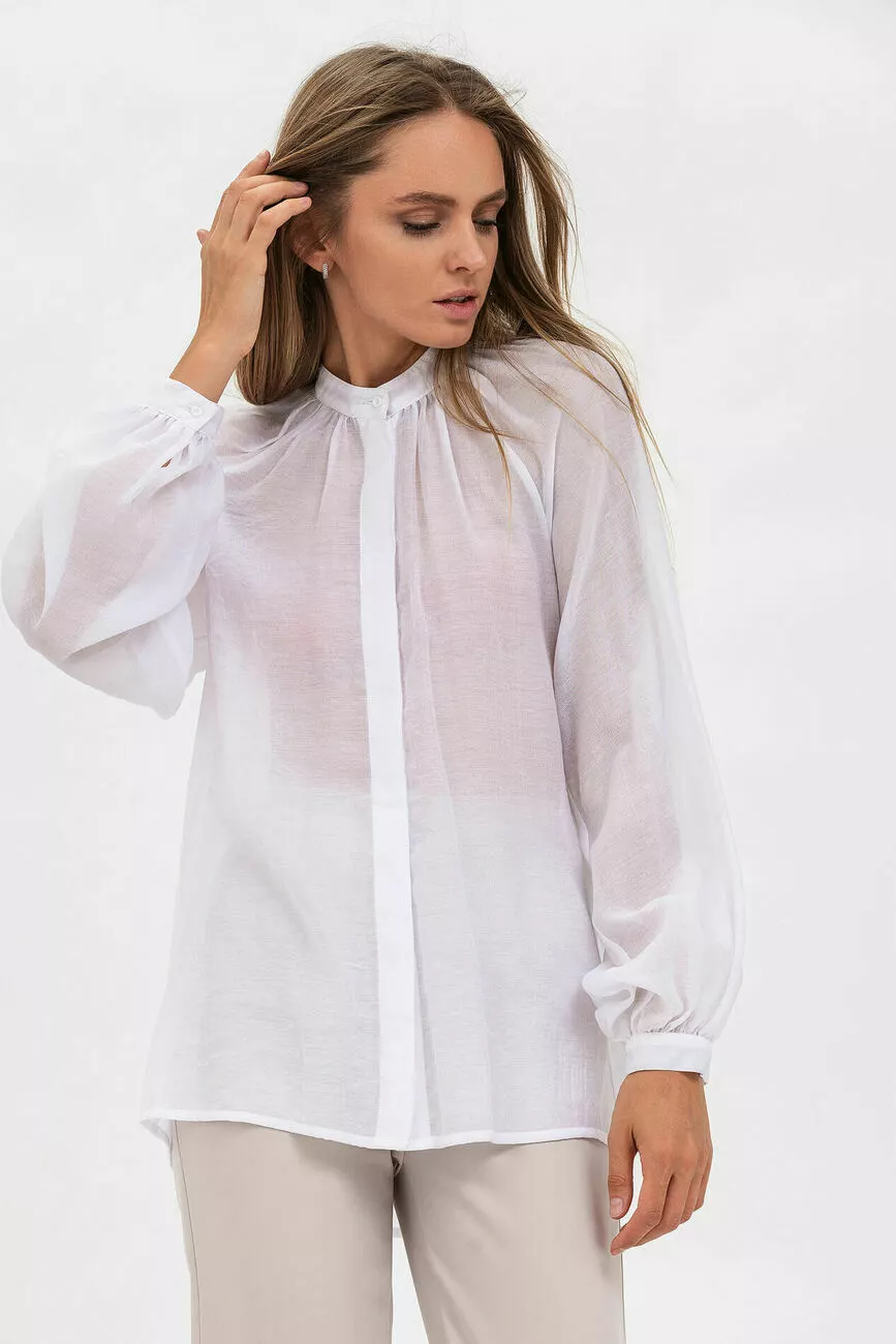 Білосніжна блуза в напівпрозорому шифоні виглядає ніжно. Ця гарна