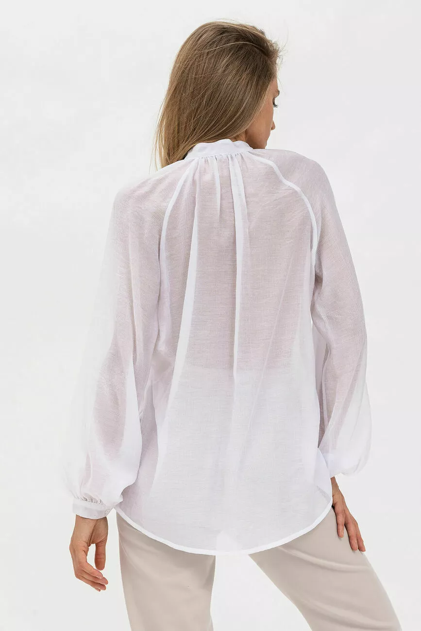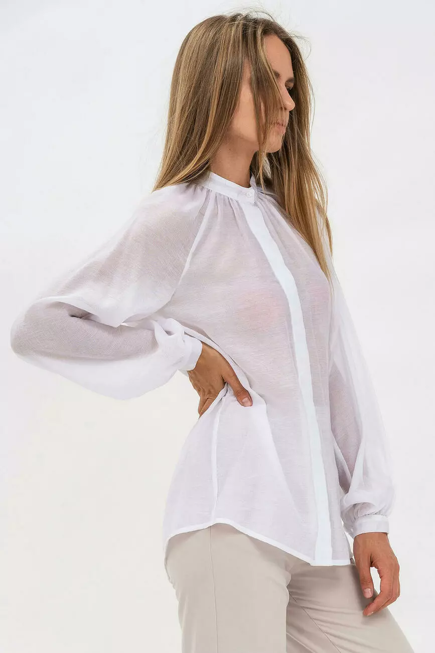 Білосніжна блуза в напівпрозорому шифоні виглядає ніжно. Ця гарна жіноча блуза перетвориться на одну з улюблених речей у вашому гардеробі: універсальна, вона доповнить і діловий, і романтичний образ. Модель із рукавом-регланом на манжеті, подовженою спинкою та супатною застібкою на гудзики. По спинці гарне складання від горловини, комір-стійка укорочений. Елегантність стане синонімом вашого образу у цій стильній блузці для жінок!