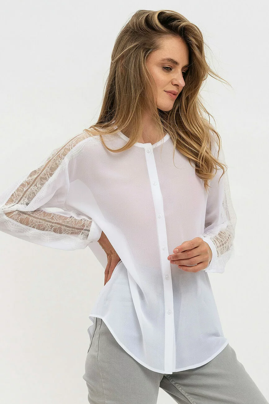 себе увагу завдяки лампасним вставкам із мережева, роблячи блузу з
