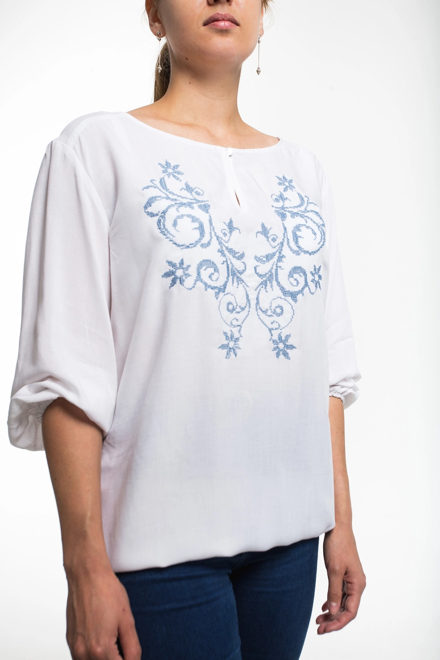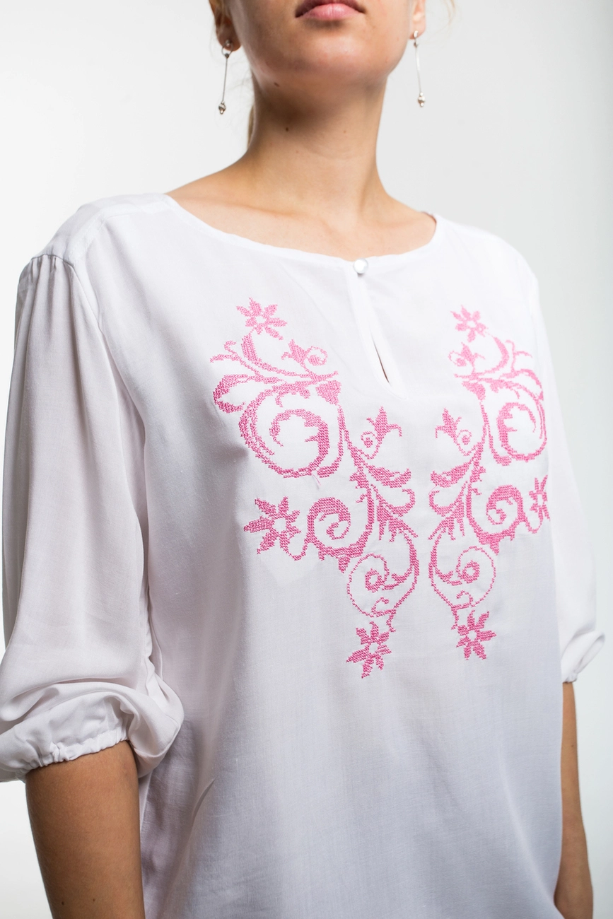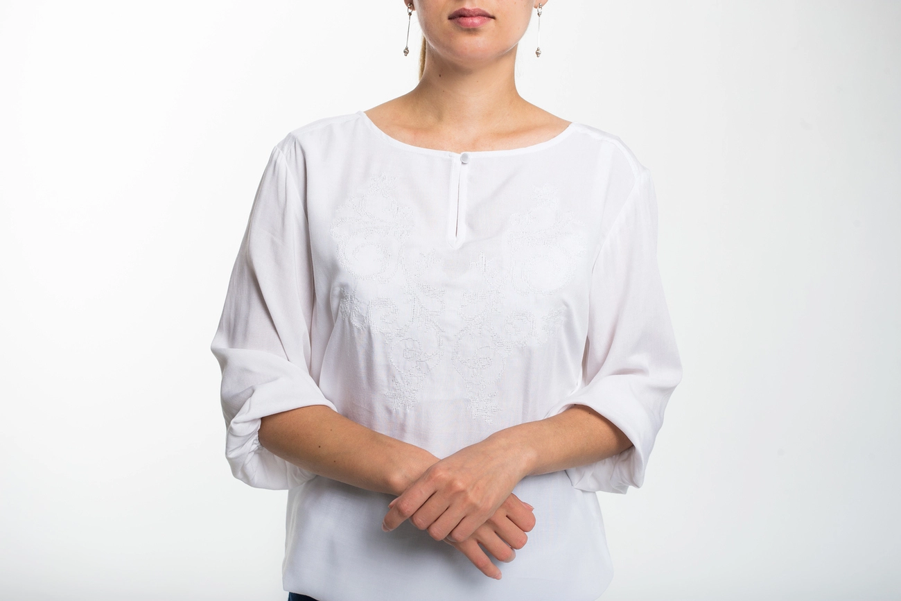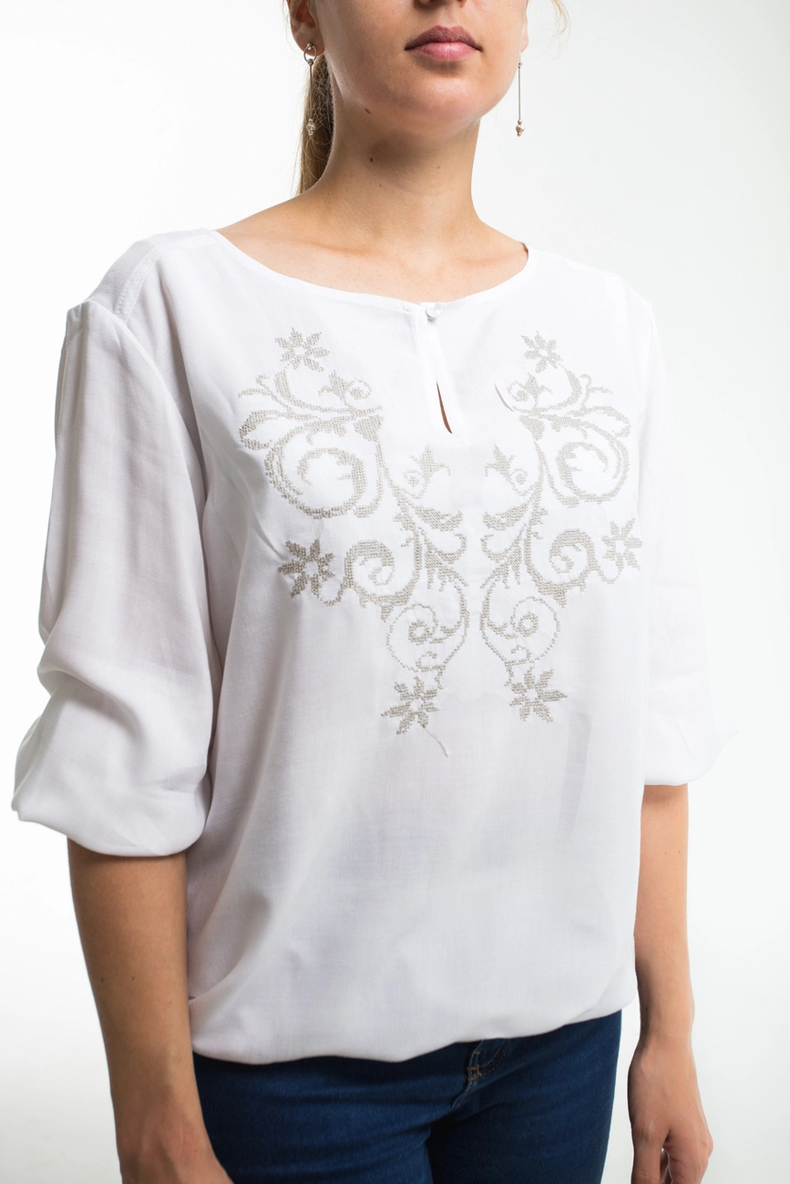 Жіноча блуза з вишивкою на білому фоні від гуртівні Leosouvenir має багатий та святковий вигляд.