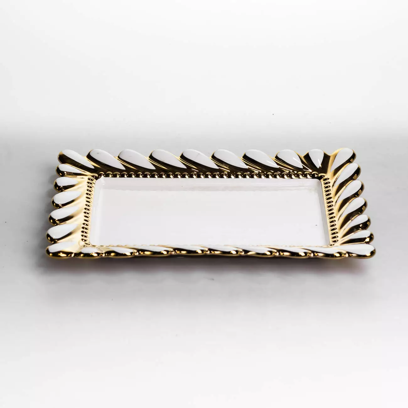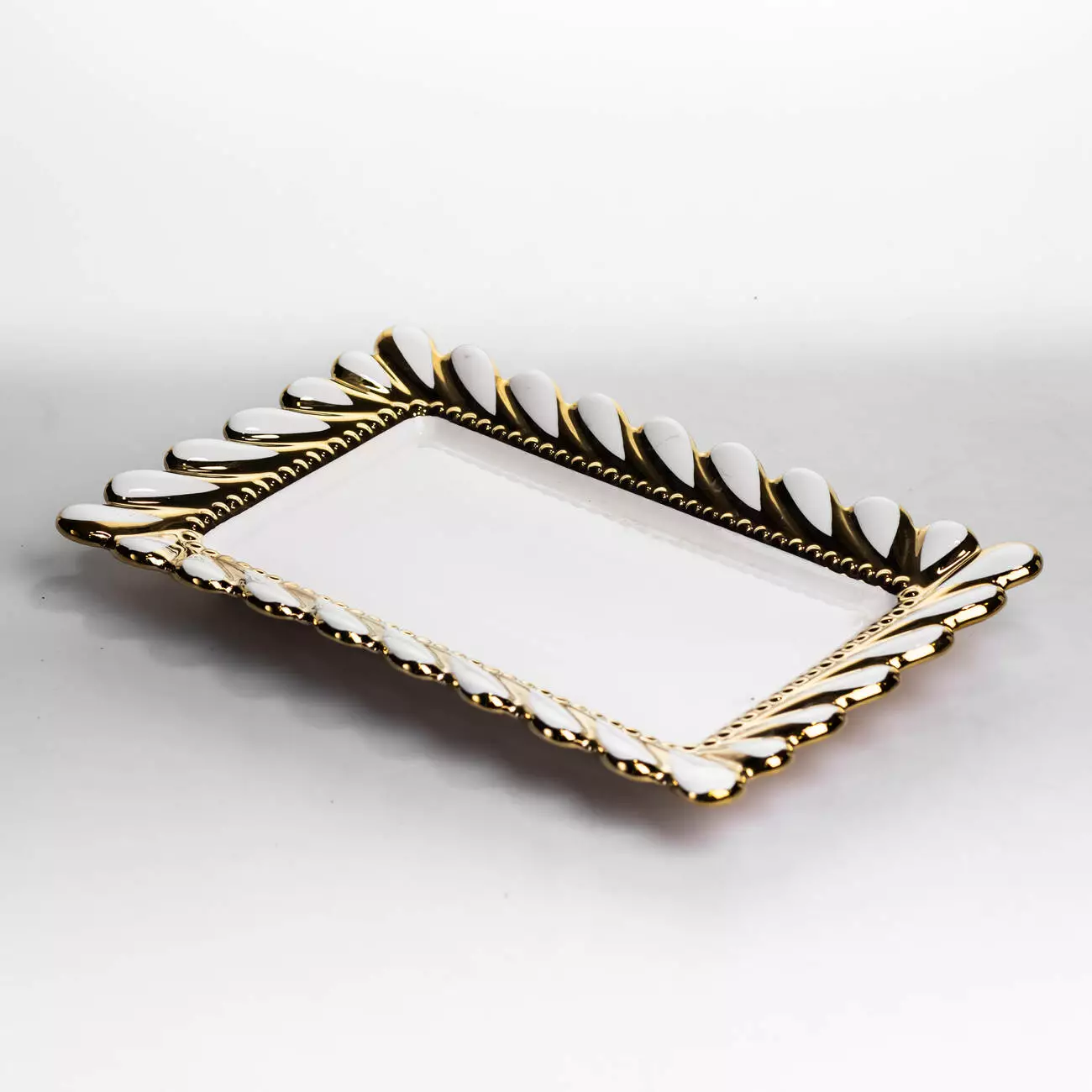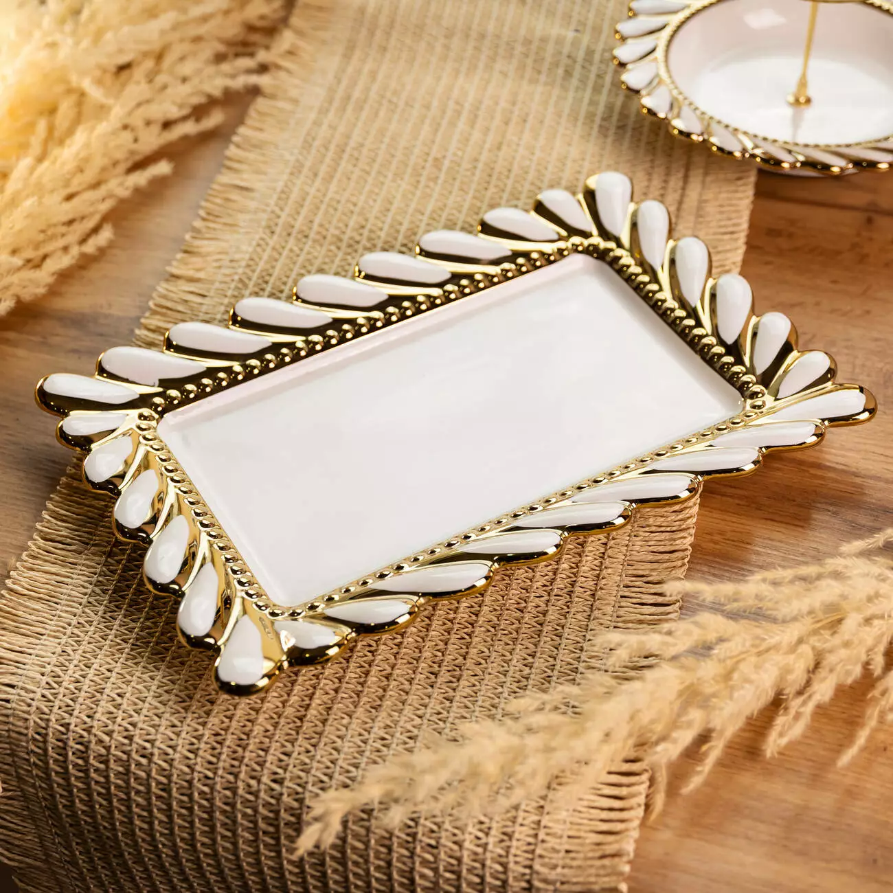 Сервірувальне блюдо Tiffany прямокутної форми розміром 30.5×20 см підходить для подачі закусок, десертів або нарізок. Завдяки витягнутій формі його зручно розміщувати на столі, особливо при сервіруванні кількох страв одночасно. Формат дозволяє акуратно викладати продукти, забезпечуючи охайний вигляд подачі.