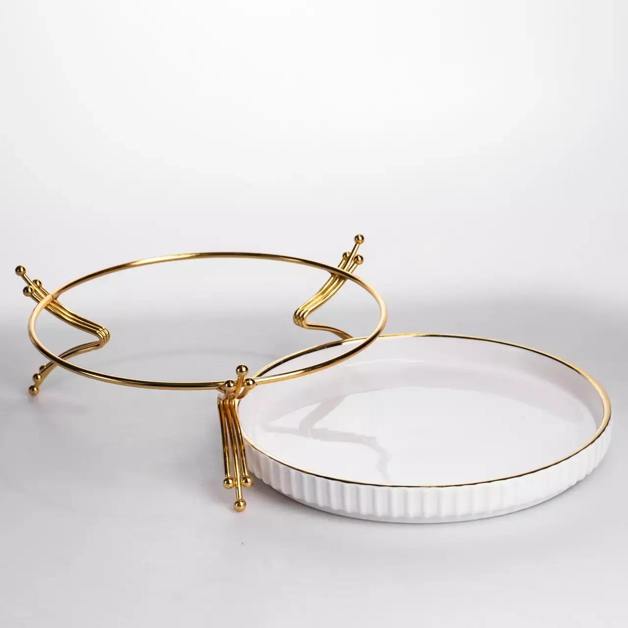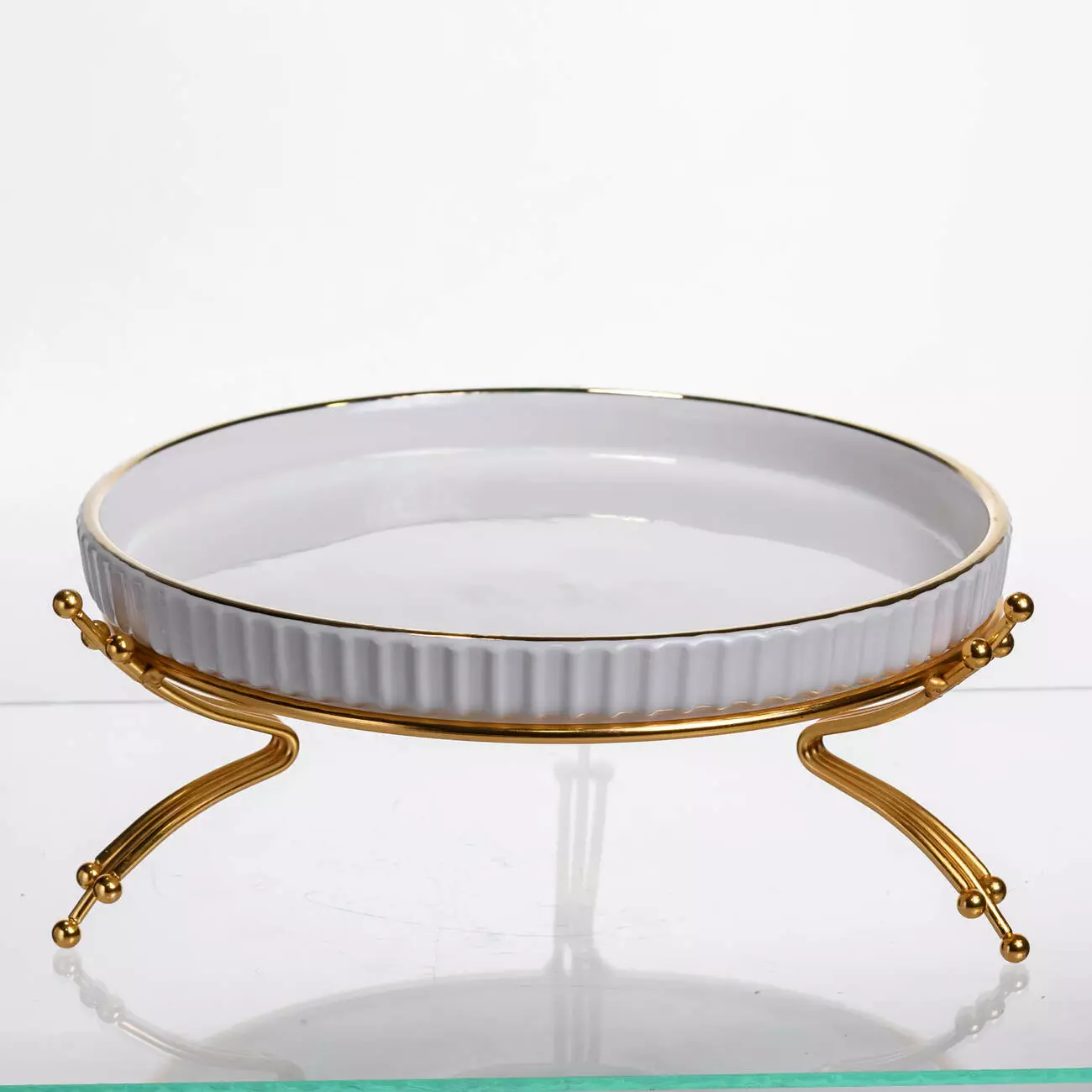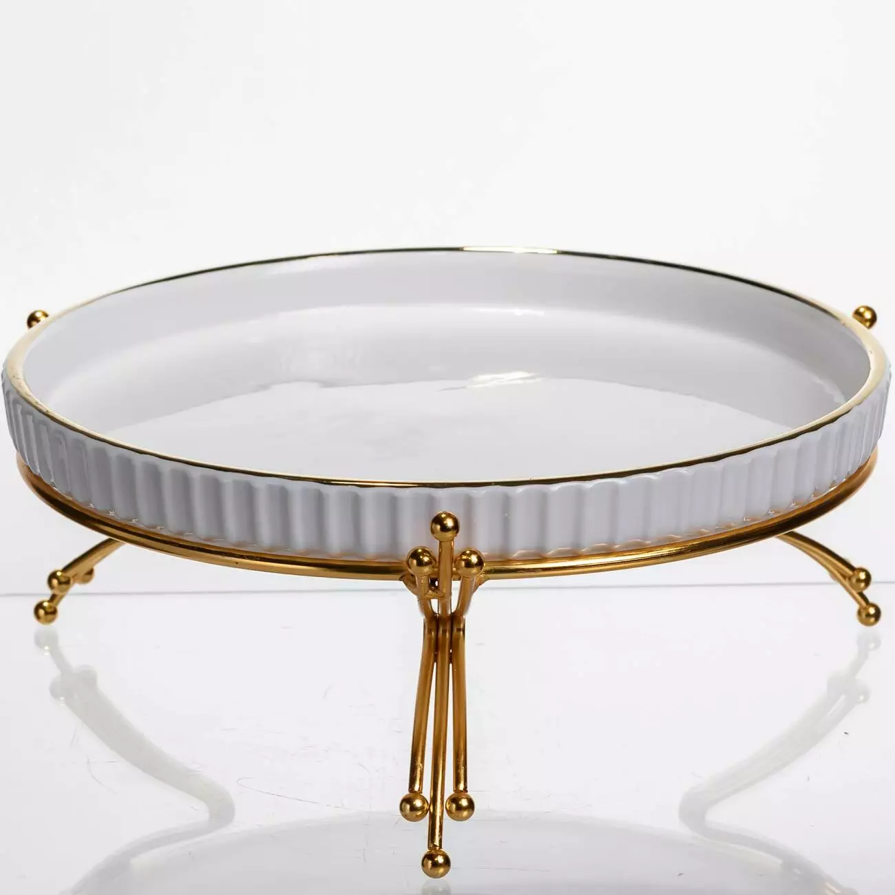Стильне порцелянове блюдо на металевій підставці - чудовий варіант для подачі закусок, тортів, пирогів, фруктових нарізок та сервірування солодощів. Гладка глазурована поверхня легко миється та стійка до плям. Підставка надає виробу елегантного вигляду, піднімає страву над іншими предметами сервірування та захищає стільницю від гарячого посуду.