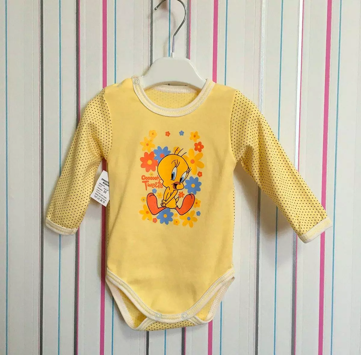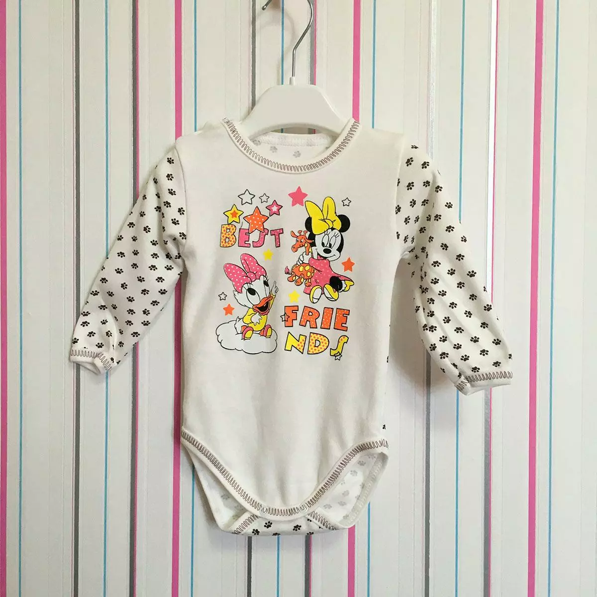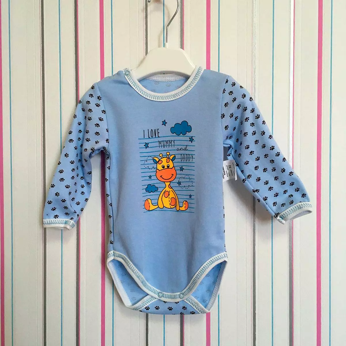 Боди с длинным рукавом комбинированный однотон+цветной интерлок, плечо и низ на кнопках, декорирован рисунком.