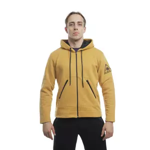 Чоловіча толстовка Urban гірчичного кольору виготовлена з тканини футер тринитка. Основний компонент футера — бавовна, яка дозволяє шкірі дихати, добре вбирає вологу та не викликає подразнень. Внутрішній шар тринитки надає виробу додаткову теплоізоляцію, роблячи його придатним для прохолодної погоди. Модель має застібку-змійку, спереду дві кишені на блискавках та капюшон, який надійно захищає від вітру.