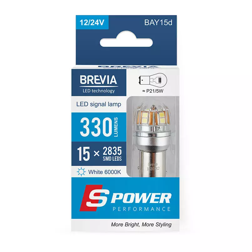 Brevia S-Power P21/5W 330Lm 15x2835SMD 12/24V CANbus, 2шт (10203X2)
