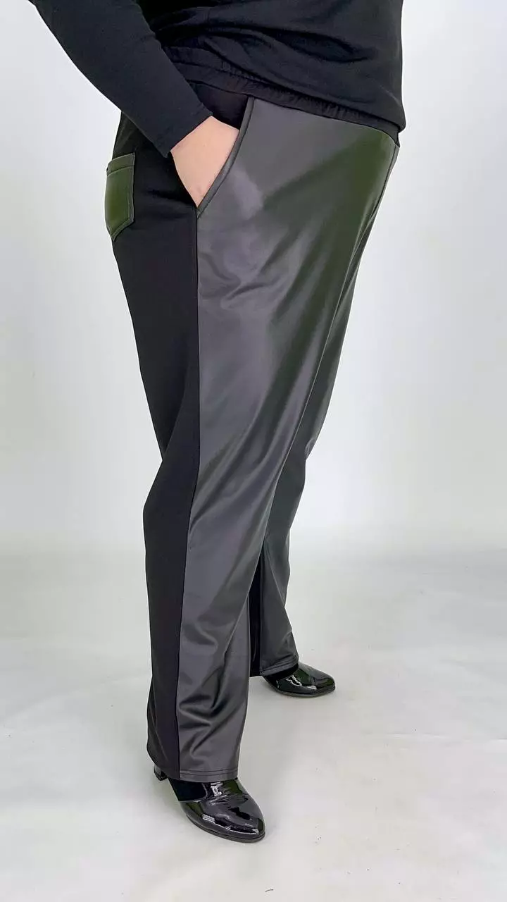тканина мікродайвінг на флісі + екошкіра на велюрі (100% поліестер) . Штани комбіновані мікродайвінгом на флісі та екошкірою на велюрі. Дуже хороша розтяжимість, висока посадка, пояс на резинці з кишенями.