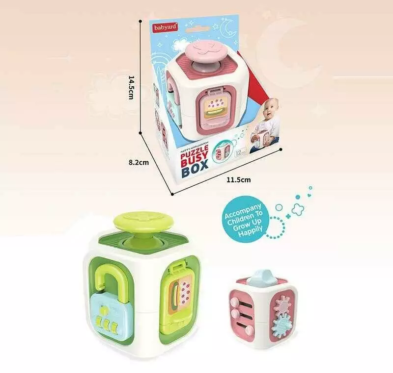 Бізіборд BY 330 (120/2) 2 кольори, кубик, розмір - 7х7х9.5 см, пальчикові ігри, тріскачка, відкриття дверцят та замочку, в коробц