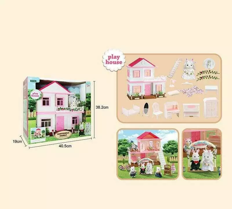 Будиночок S 05 (6), 2 поверхи, меблі, підсвічування, флоксова фігурка кролика, в коробці
