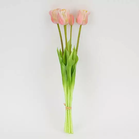 Букет із п’яти латексних тюльпанів у ніжно-рожевому відтінку вражає своєю реалістичністю і витонченим виглядом. Завдяки якісному латексу бутони мають природну форму, м’яку матову поверхню та виглядають як справжні живі квіти навіть з близької відстані. Діаметр бутона близько 5 см відповідає натуральному розміру тюльпанів, а висота букету 49 см дозволяє створити гарну, пропорційну композицію у вазі без додаткового оформлення.