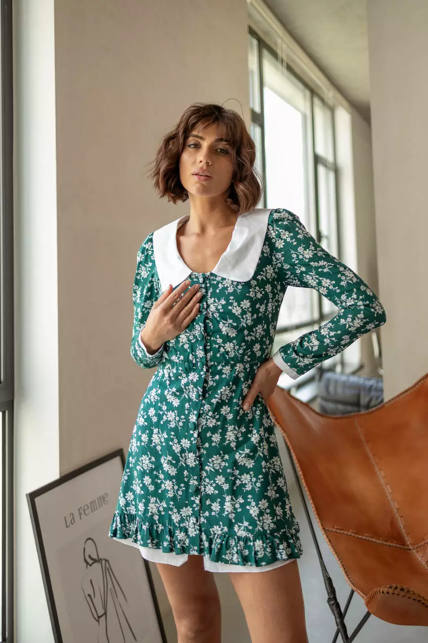 Чарівна сукня з красивим білим комірцем має приталений крій, який ідеально підкреслює фігуру та вільну спідницю, рукава з білими манжетами.