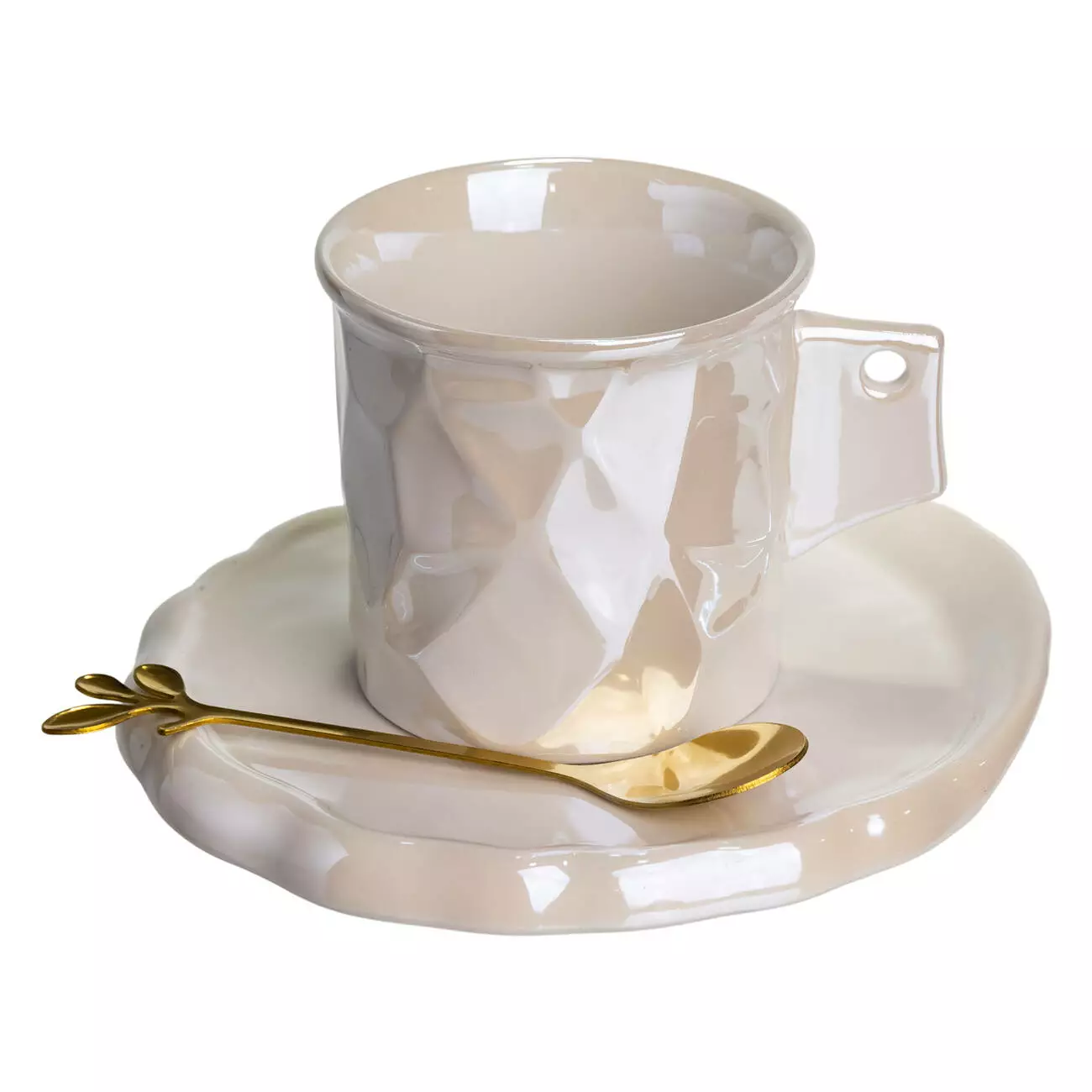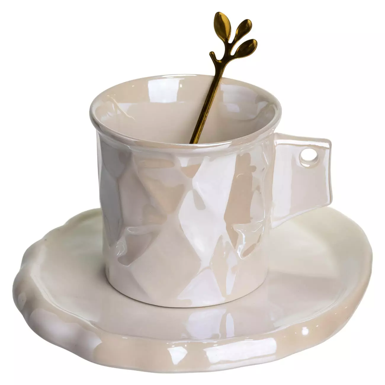 Чашка для кави порцелянова 200 мл з блюдцем і ложкою в дзеркальній глазурі, білий