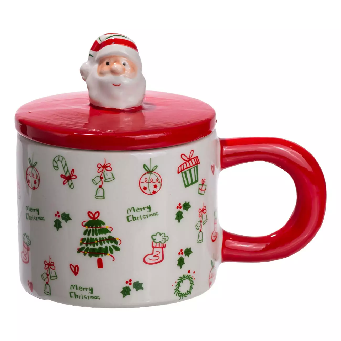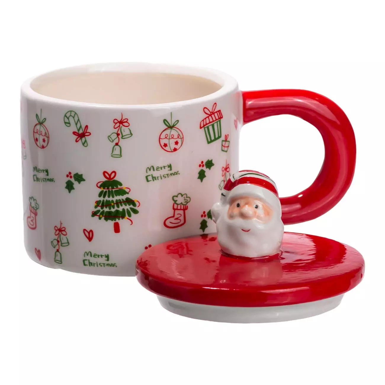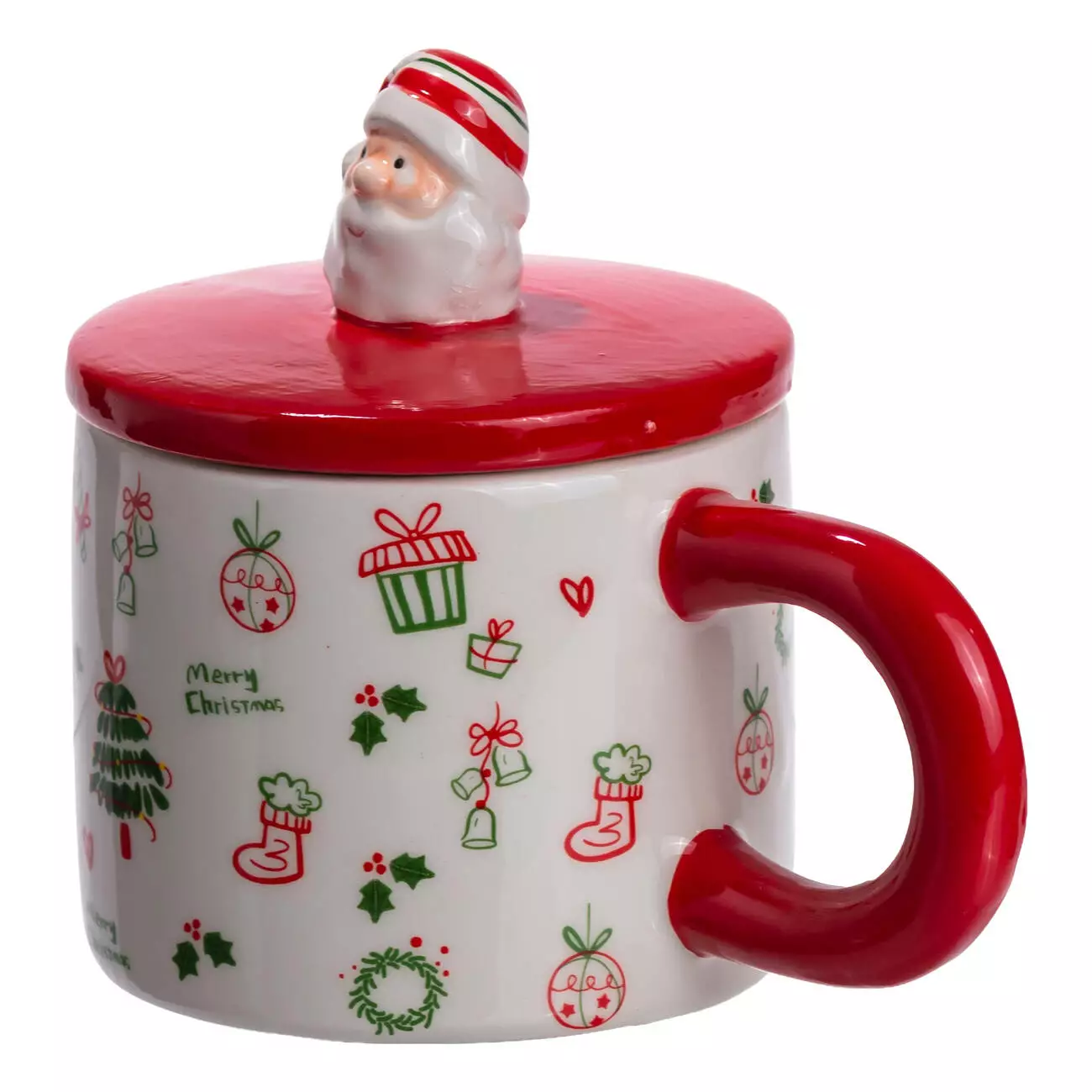 Кришка виготовлена з якісної порцеляни та щільно прилягає до чашки, зберігаючи температуру напою. Особливу увагу привертає ручка на кришці у вигляді Санти — оригінальний декоративний акцент, який додає виробу святковості та чарівності. Завдяки цій деталі чашка стає не просто предметом посуду, а маленьким елементом різдвяного декору.