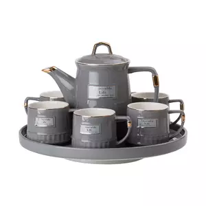 Чайний сервіз "Enjoynbie Life" на 6 персон складається з 8 предметів і виконаний у стильному сірому кольорі. У набір входять 6 чашок об'ємом 300 мл, один чайник місткістю 1.5 літри й таця, що забезпечує зручність у сервіруванні. Всі елементи виготовлені з якісного порцеляни, що гарантує довговічність і приємний естетичний вигляд.