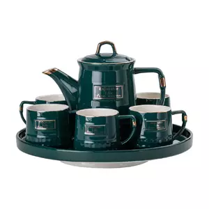 Чайний сервіз "Enjoynbie Life" на 6 персон складається з 8 предметів і виконаний у стильному зеленому кольорі. У набір входять 6 чашок об'ємом 300 мл, один чайник місткістю 1.5 літри й таця, що забезпечує зручність у сервіруванні. Всі елементи виготовлені з якісного порцеляни, що гарантує довговічність і приємний естетичний вигляд.
