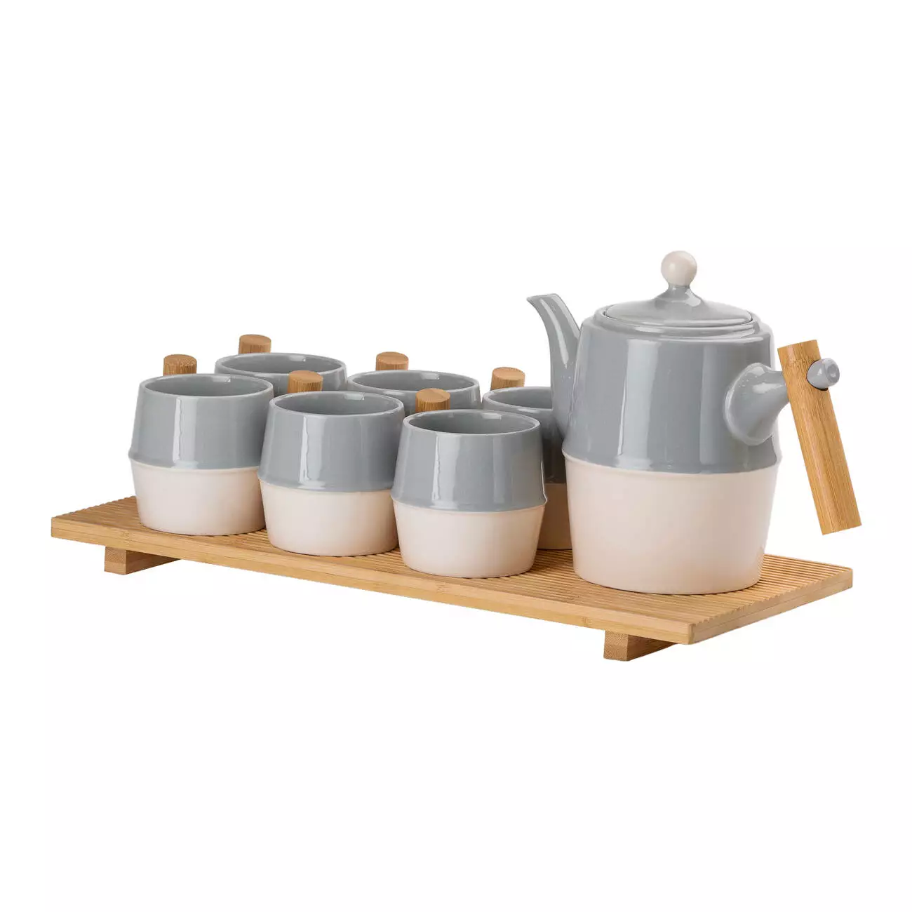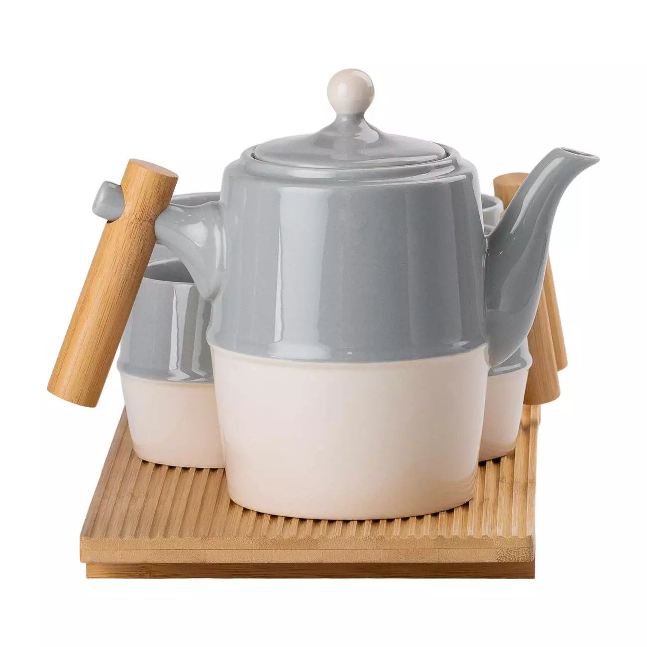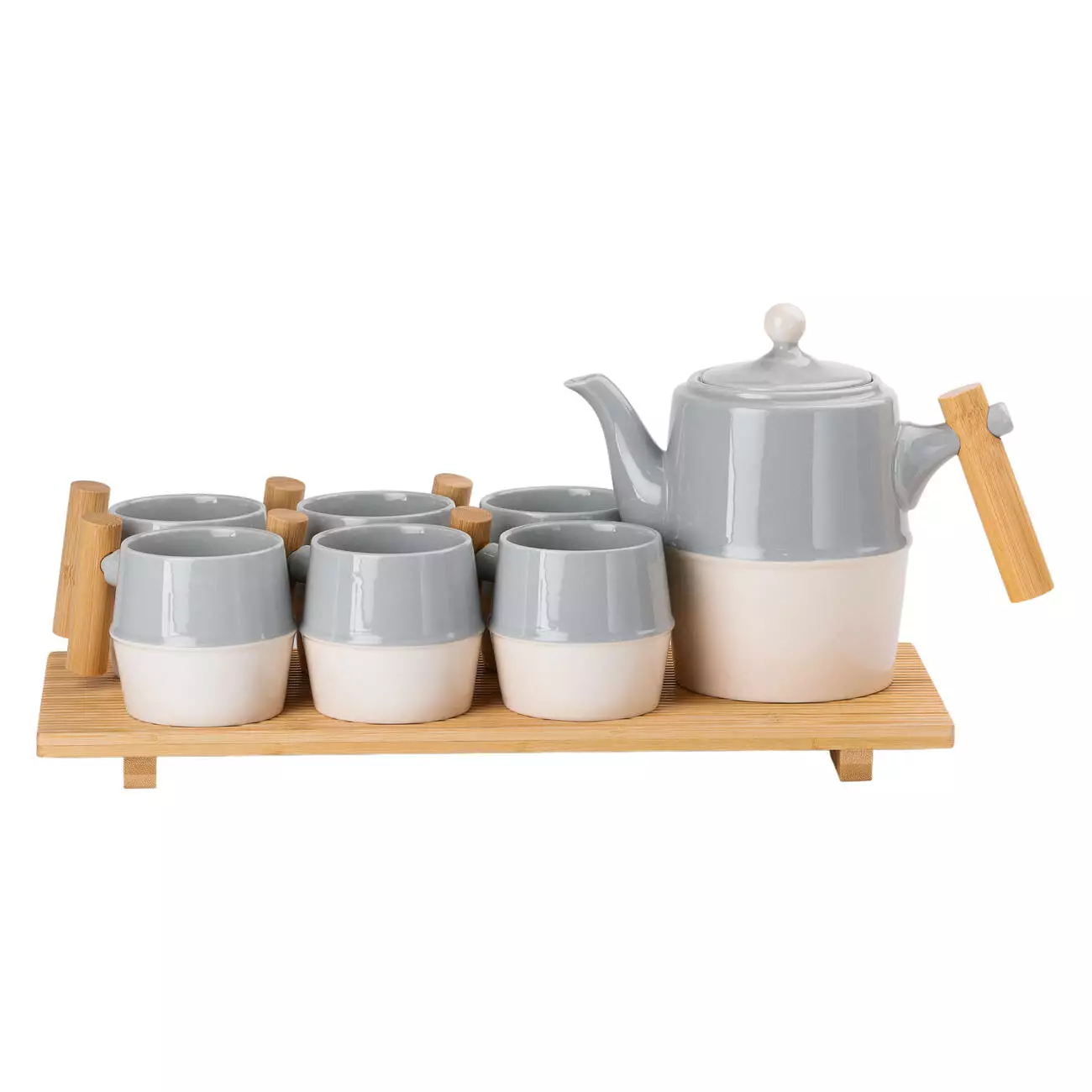 Чайний сервіз порцеляновий на бамбуковій підставці 8 предметів, сірий з білим