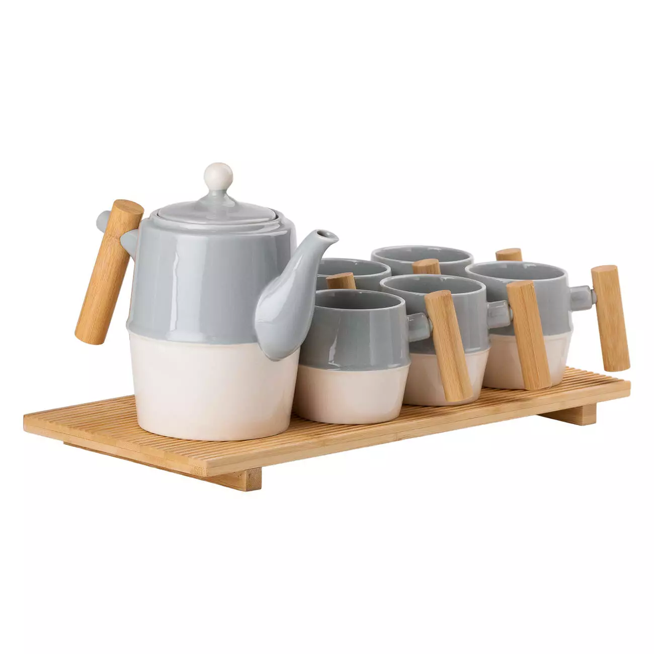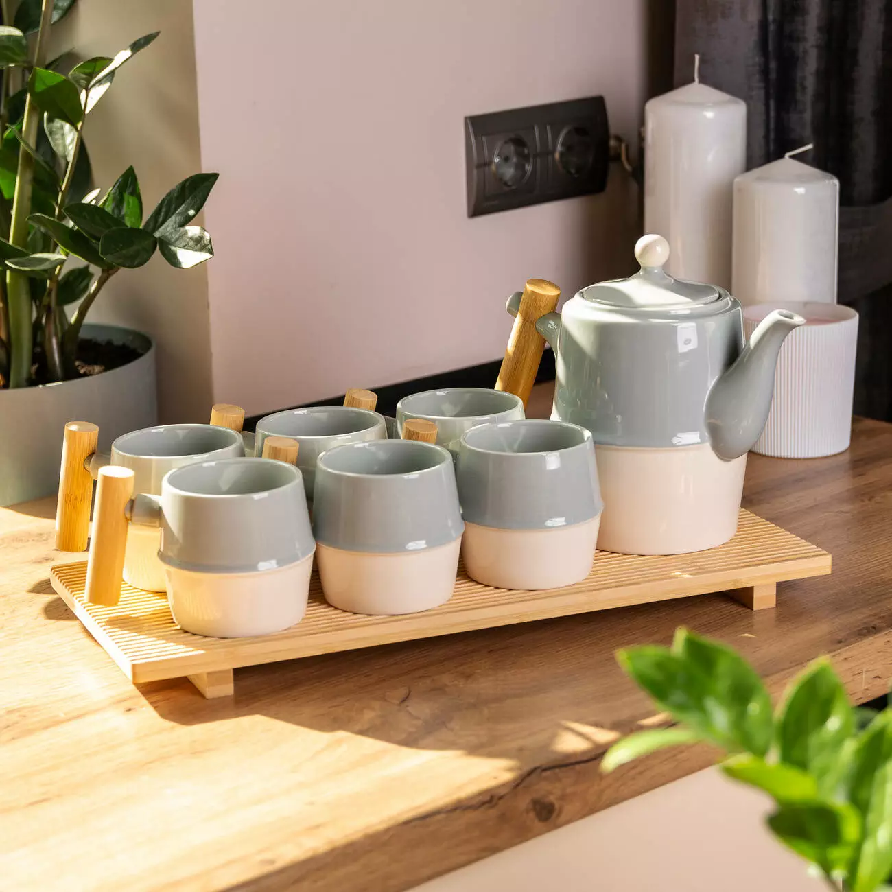 Чайний сервіз порцеляновий на бамбуковій підставці — це елегантний набір із 8 предметів, що поєднує стиль і функціональність. Сервіз виконаний у гармонійному поєднанні сірого та білого кольорів, що надає йому природної естетики та сучасного вигляду. До складу набору входить чайник об'ємом 1,3 л і шість чашок по 300 мл. Особливістю цього сервізу є бамбукові ручки на чайнику та чашках, які додають тепла та природного шарму, а також зручна бамбукова підставка для зберігання.