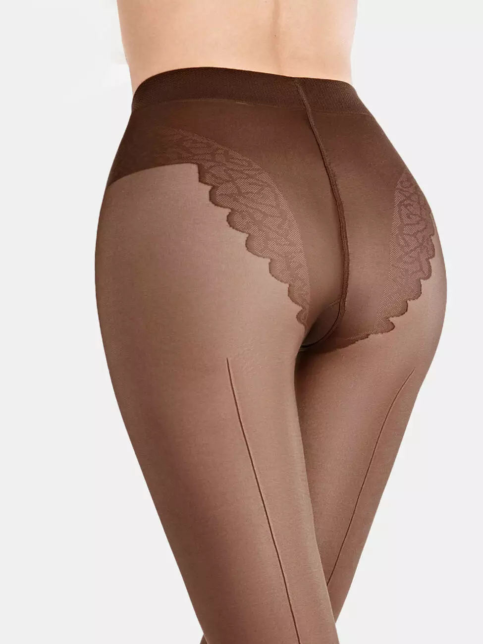 Жіночі колготки 20 DEN з мереживними трусиками та декоративним швом уздовж ноги — стильний акцент для витонченого образу. Прозора матова текстура виглядає акуратно та елегантно. Середня посадка забезпечує комфорт, а пласкі шви й бавовняна ластовиця гарантують зручність у щоденному носінні.
