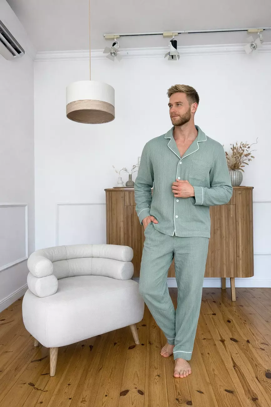 Чоловіча муслінова піжама штани+сорочка довгий рукав VIVA, евкаліпт