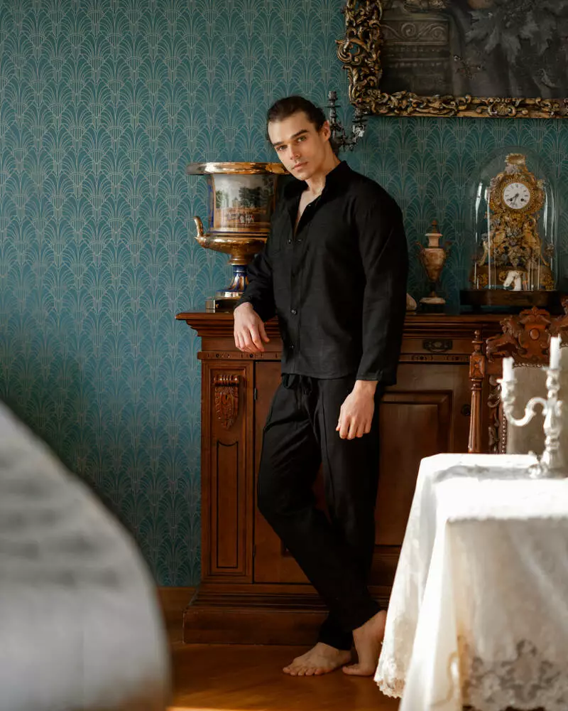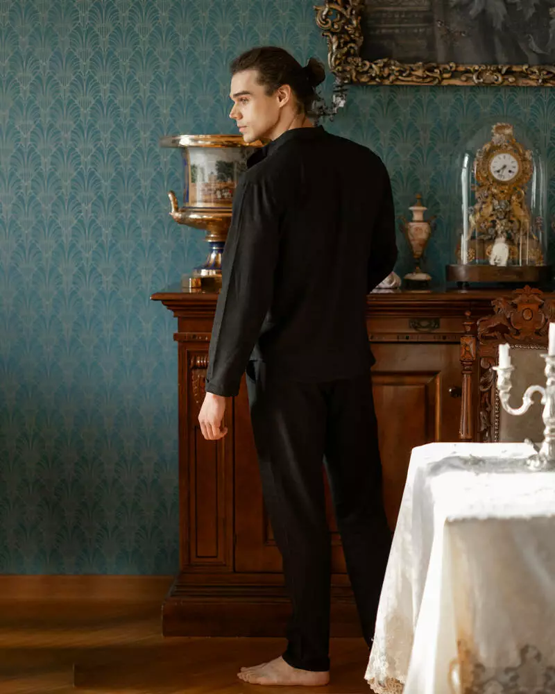 Чоловічий домашній натуральний костюм з льону. Комплект: сорочка на ґудзиках із кишенею на грудях та комірцем-стійкою і вільні штани з кишенями із зав'язкою на резинці. Матеріал досить приємний, добре пропускає повітря, не прилипає до тіла, не линяє після прання, зносостійкий. Це чудовий варіант домашнього одягу для чоловіків, що поєднує в собі стиль, комфорт та практичність.
