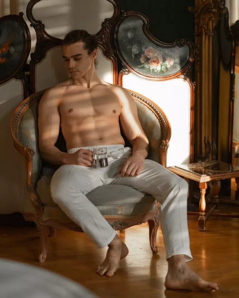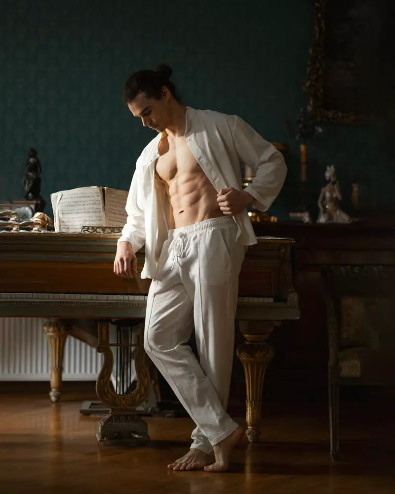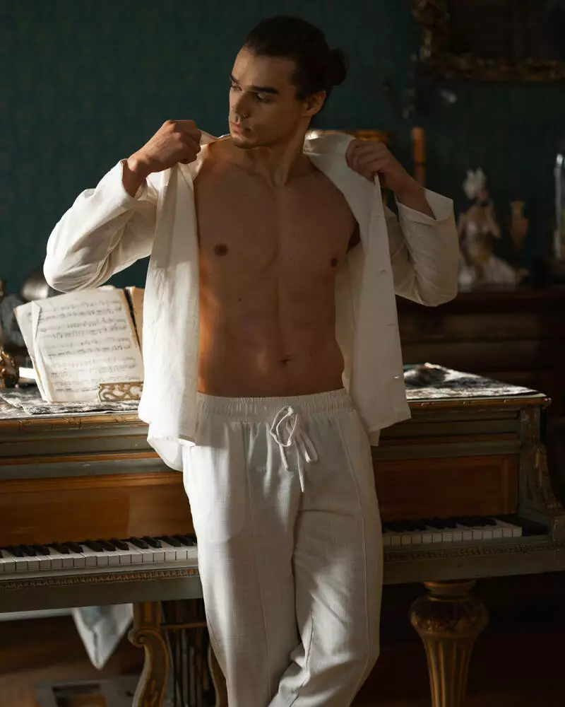 Чоловічий домашній натуральний костюм з льону. Комплект: сорочка на ґудзиках із кишенею на грудях та комірцем-стійкою і вільні штани з кишенями із зав'язкою на резинці. Матеріал досить приємний, добре пропускає повітря, не прилипає до тіла, не линяє після прання, зносостійкий. Це чудовий варіант домашнього одягу для чоловіків, що поєднує в собі стиль, комфорт та практичність.