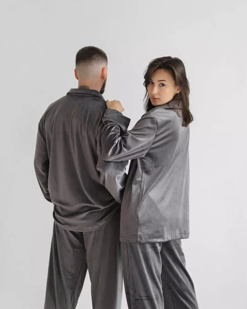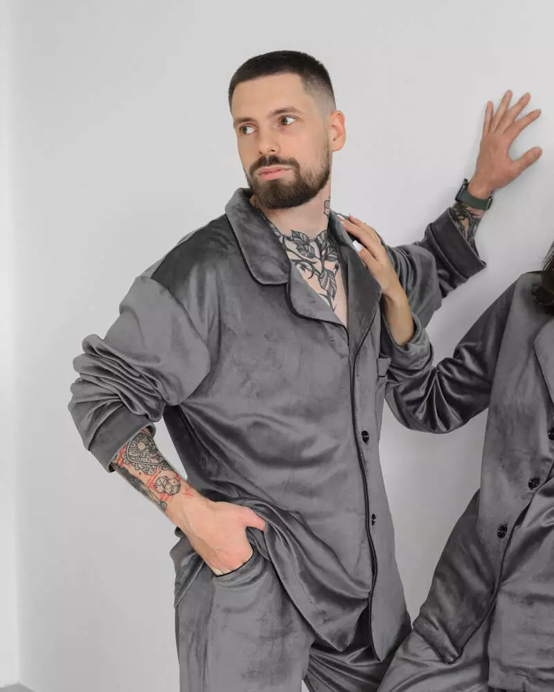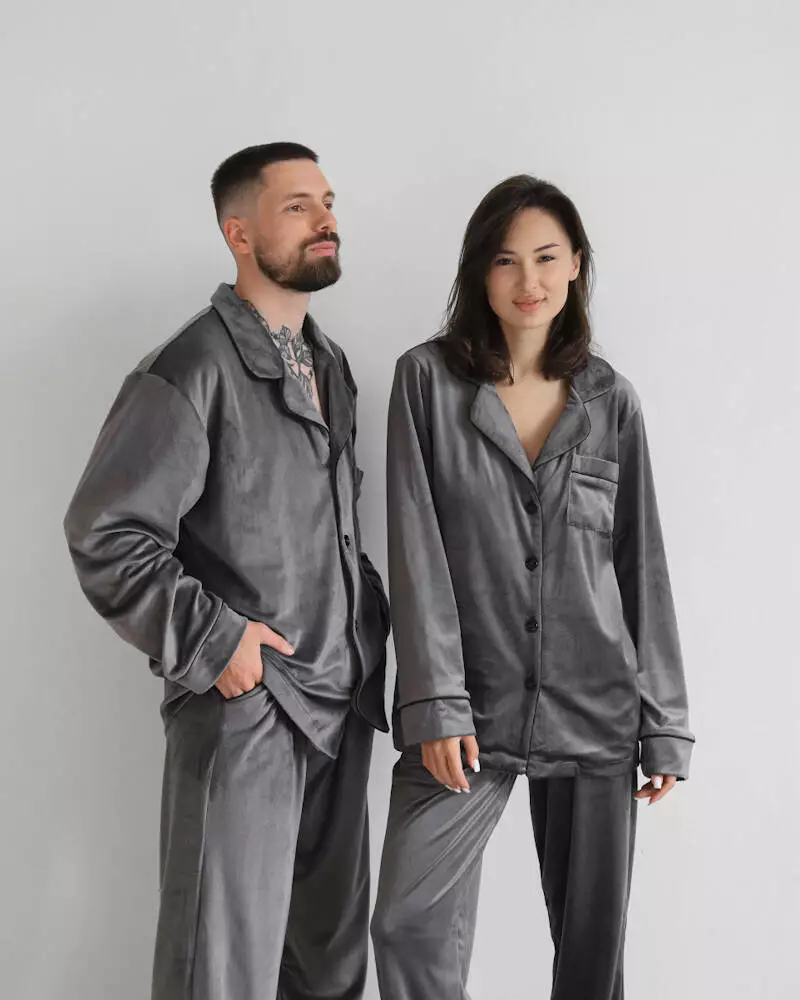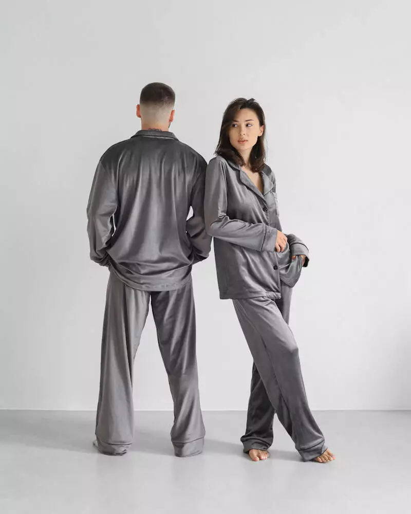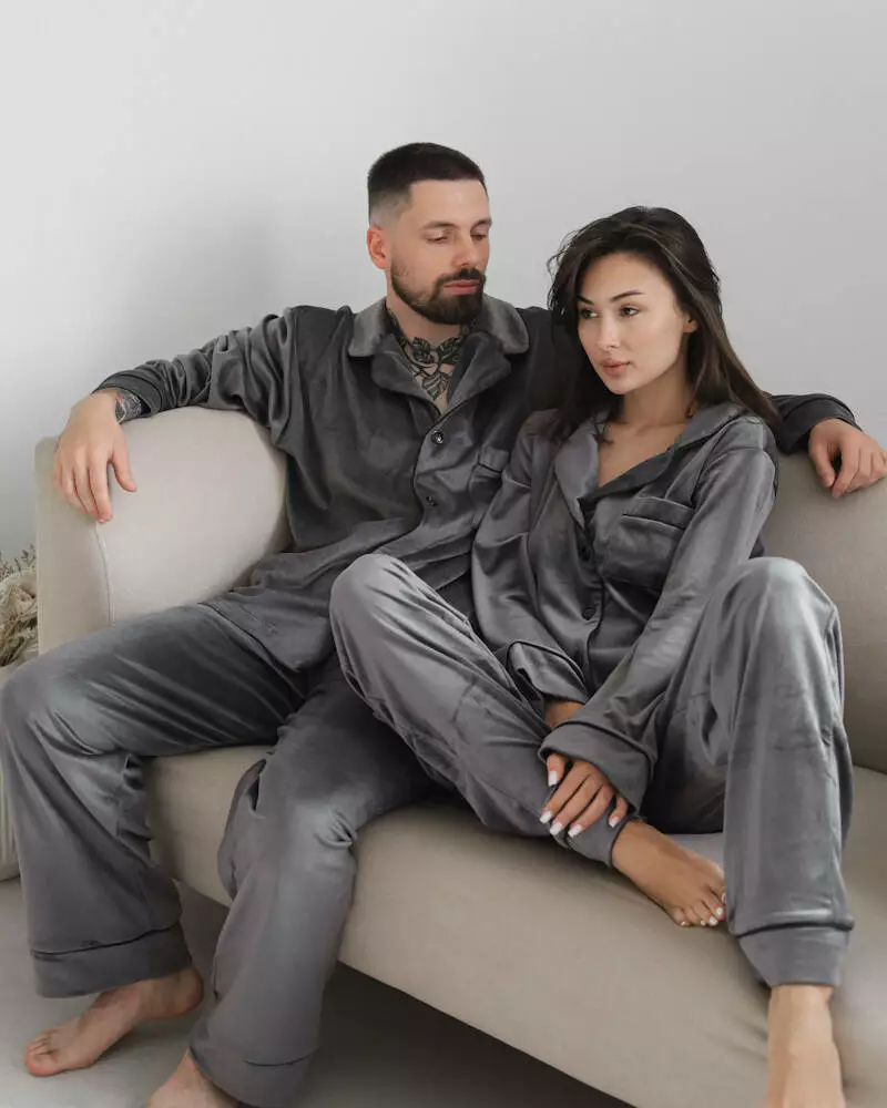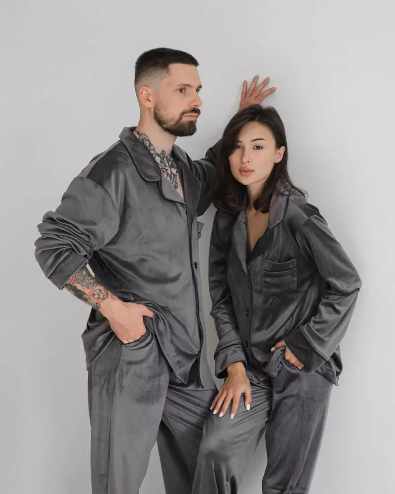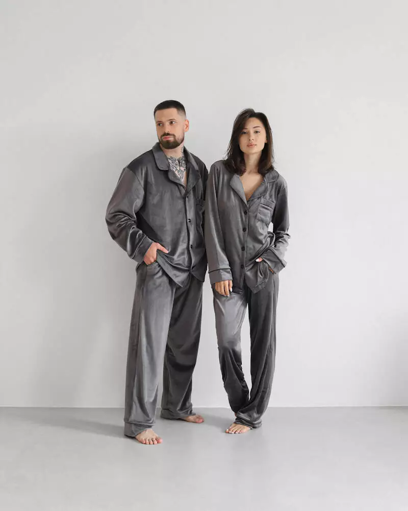 Чоловіча піжама з якісного турецького велюру на бавовняній основі. Комплект: сорочка на ґудзиках із кишенею на грудях та вільні штани з кишенями. Матеріал м'який, досить приємний, не линяє після прання, не сипеться, теплоємний, довго зберігає початковий вигляд.