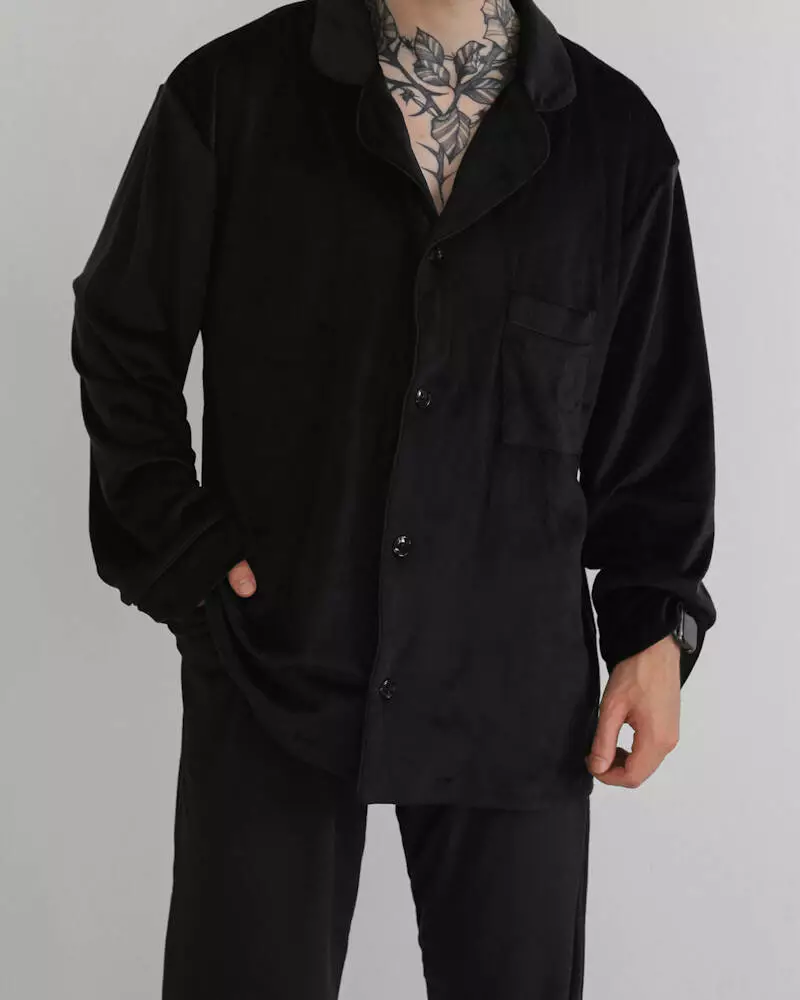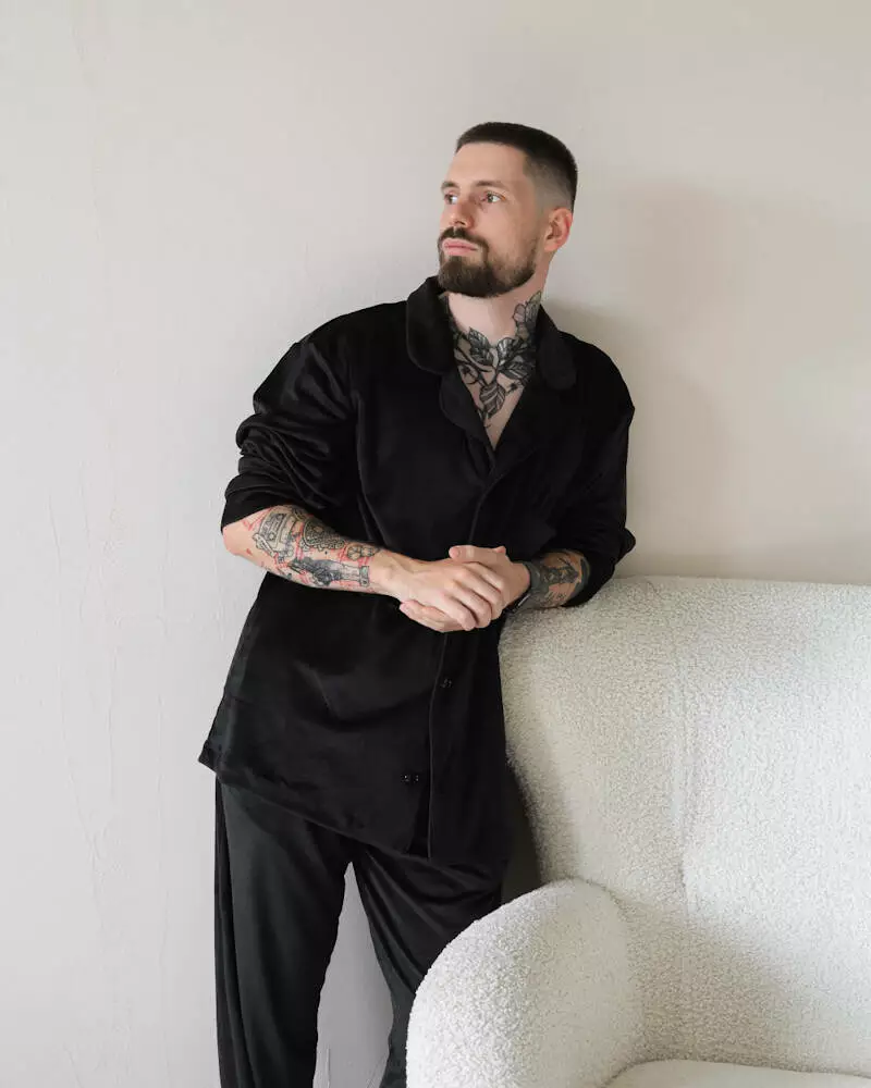 Чоловіча піжама з якісного турецького велюру на бавовняній основі. Комплект: сорочка на ґудзиках із кишенею на грудях та вільні штани з кишенями. Матеріал м'який, досить приємний, не линяє після прання, не сипеться, теплоємний, довго зберігає початковий вигляд.