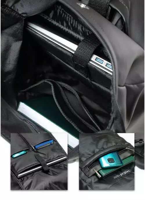 Есть карманы на молнии спереди, на спинке рюкзака и внутри,
