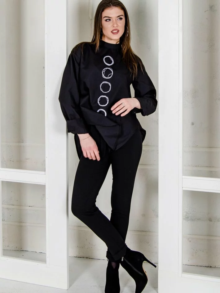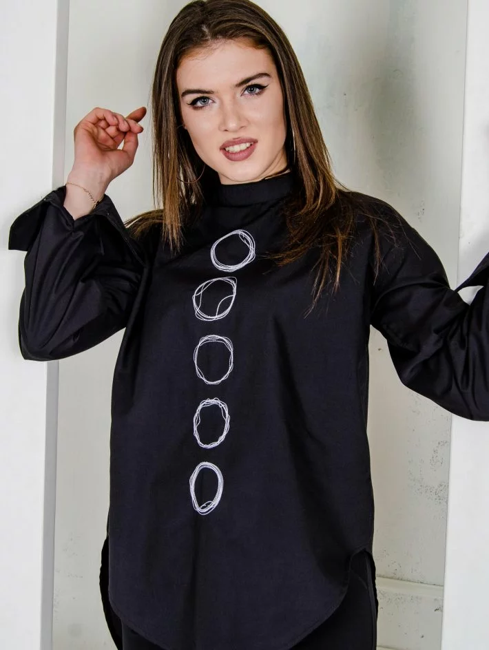 Оригінальна блуза з розремом на спинці, горловиною стійкою і довгим
