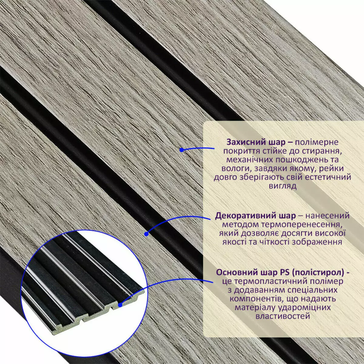 1. Захисний шар – полімерне покриття стійке до стирання, механічних пошкоджень та вологи, завдяки якому, рейки довго зберігають свій естетичний вигляд.