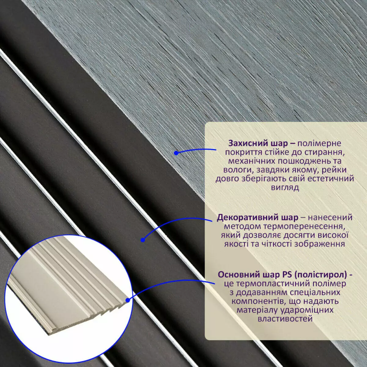 1. Захисний шар – полімерне покриття стійке до стирання, механічних пошкоджень та вологи, завдяки якому, рейки довго зберігають свій естетичний вигляд.