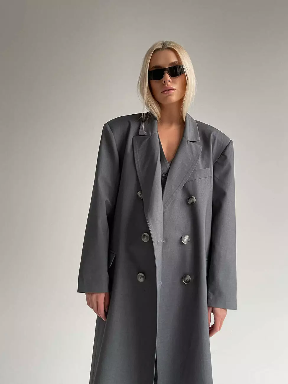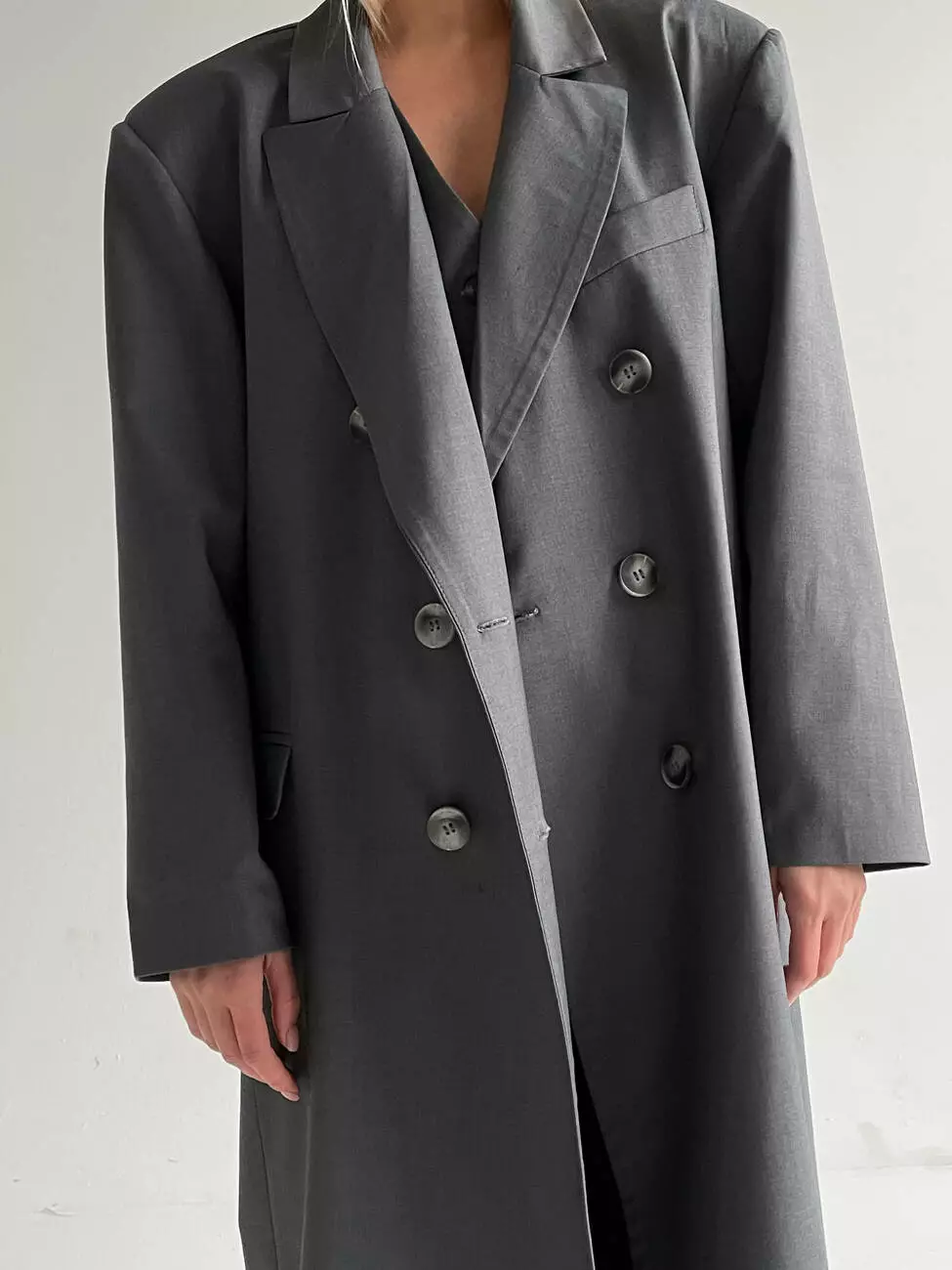 Двобортне пальто пошито прямого крою, має відкладний комір з лацканами, з обох боків дві робочі кишені клапана та одна прорізна кишеня з листочком.
