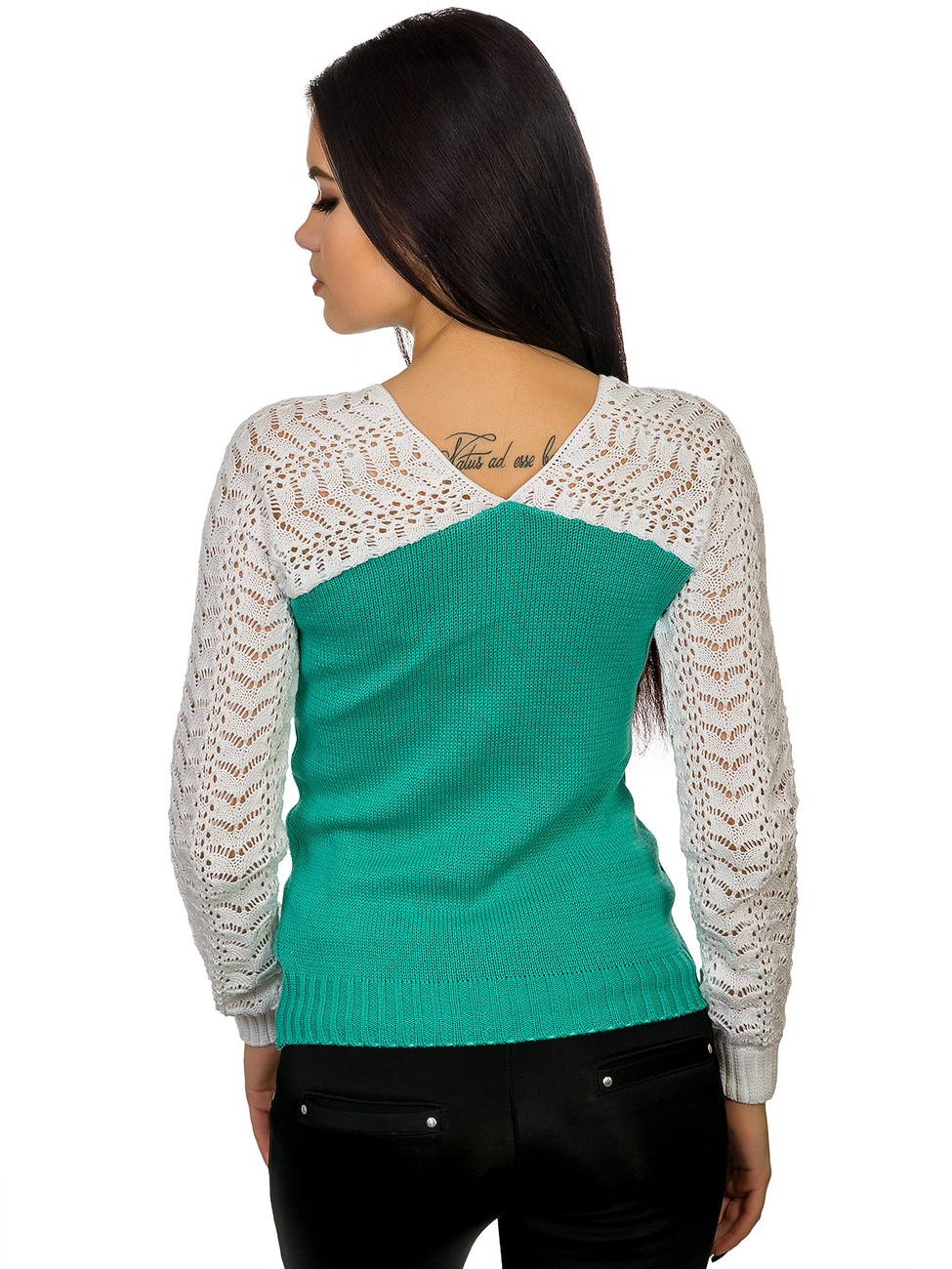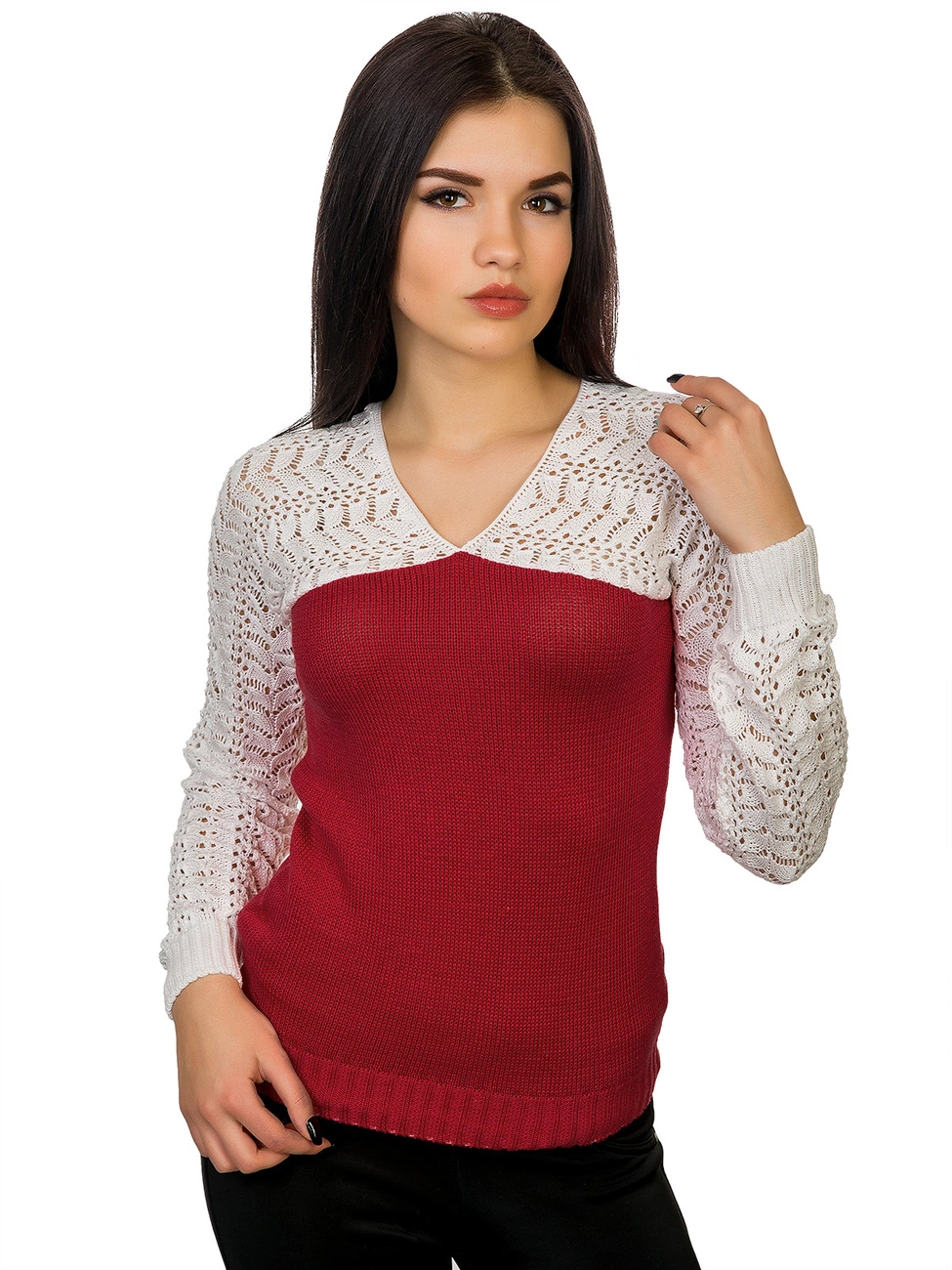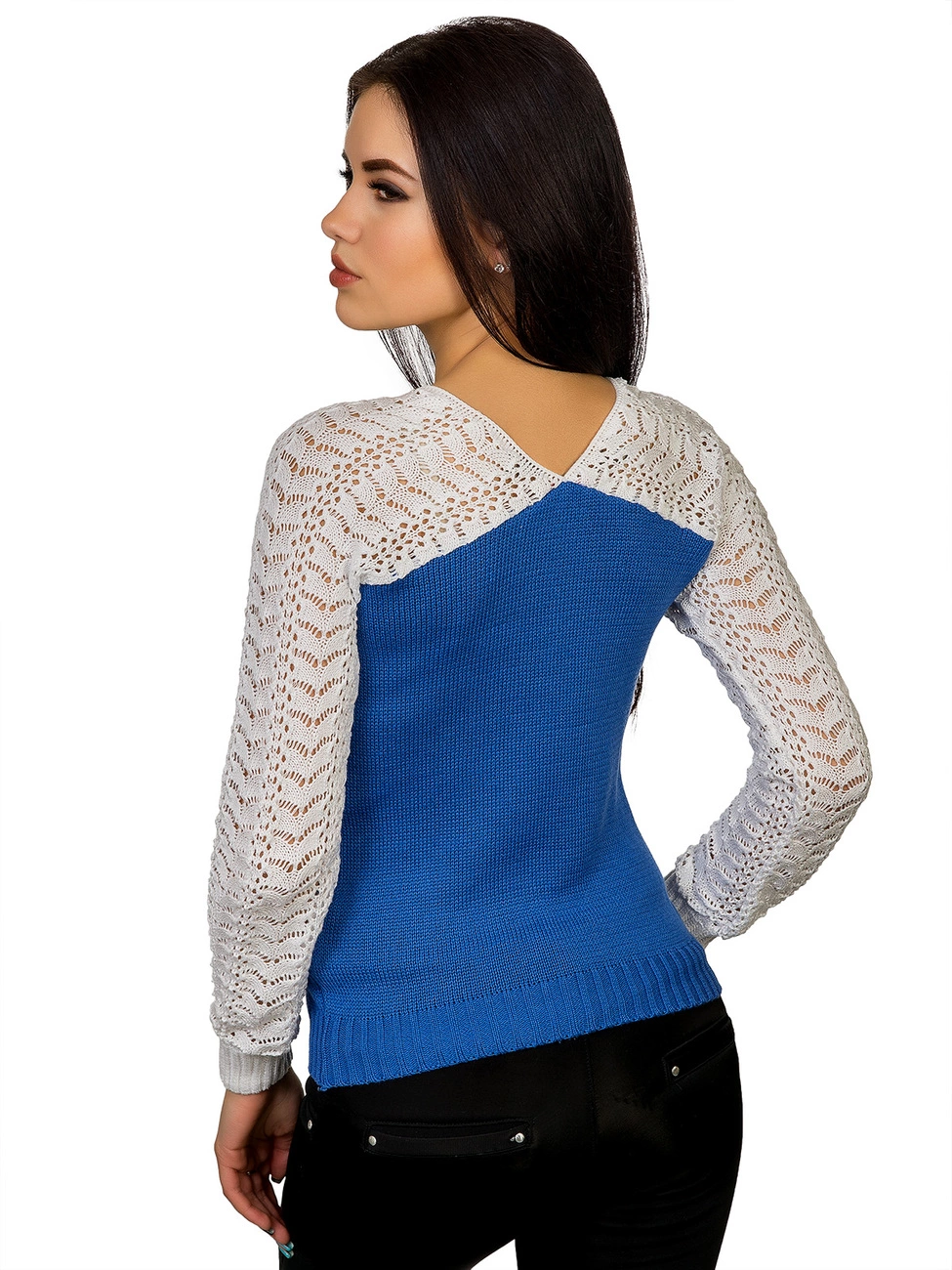 выполнены ажурной вязкой. Горловина выполнена V-образным вырезом.