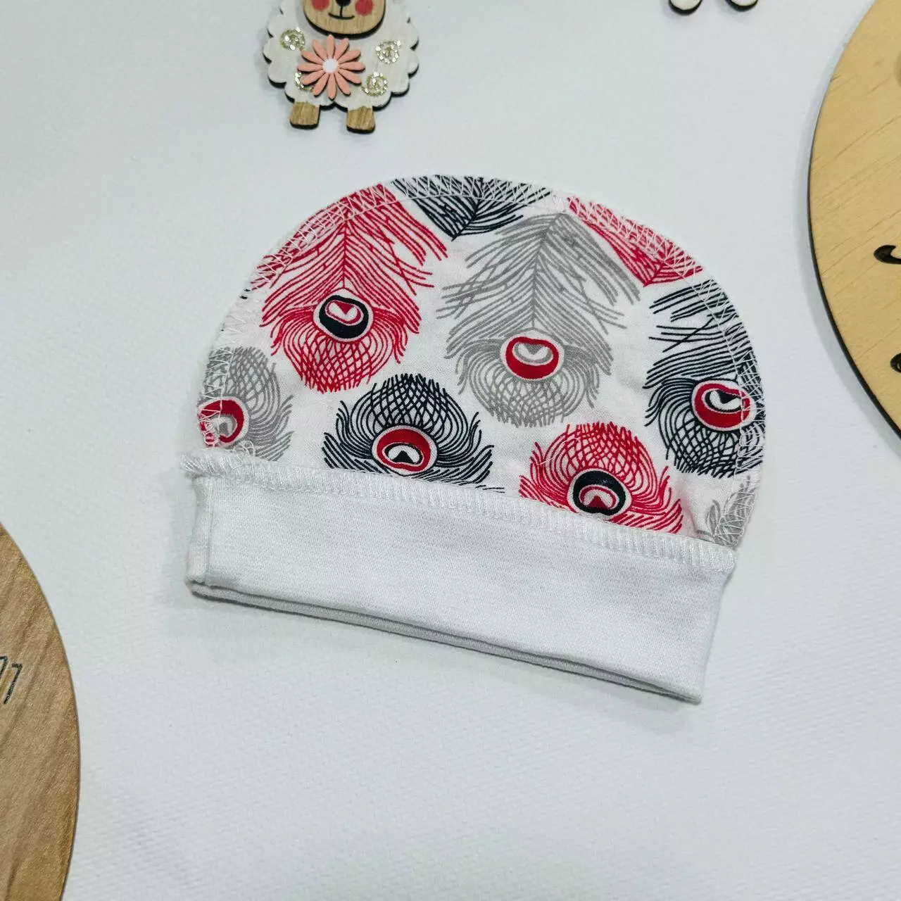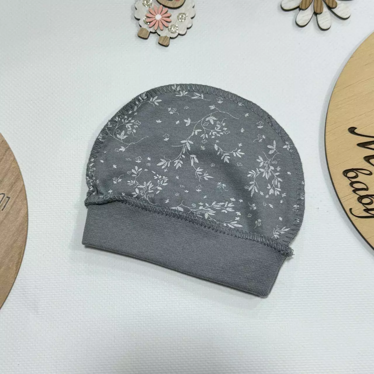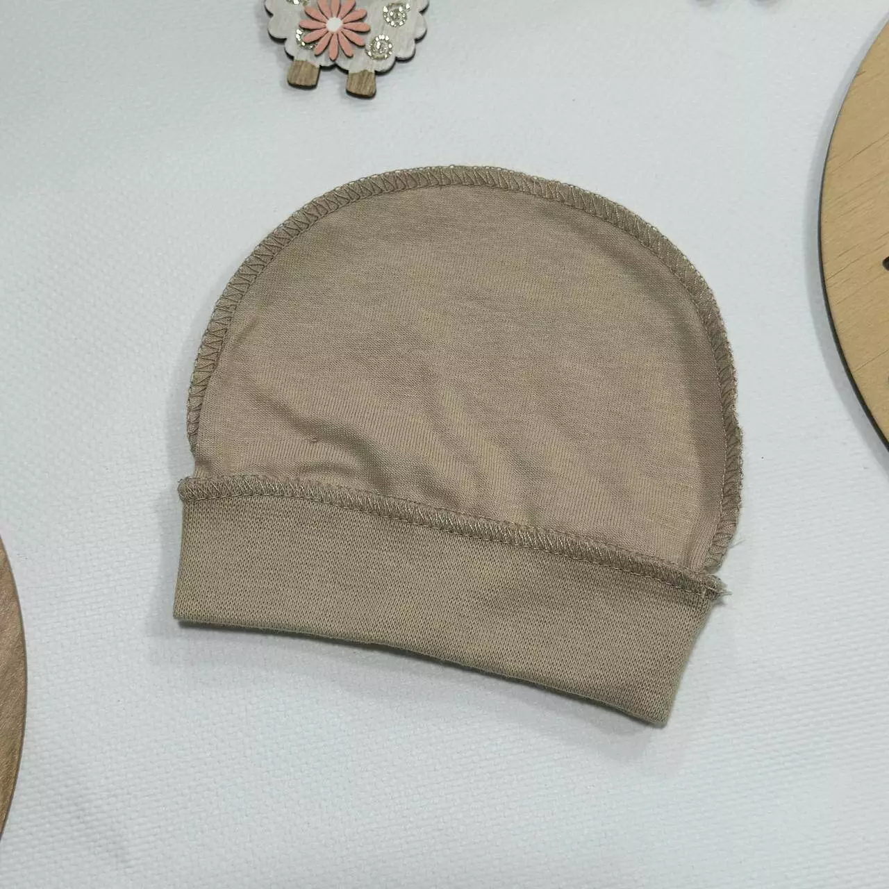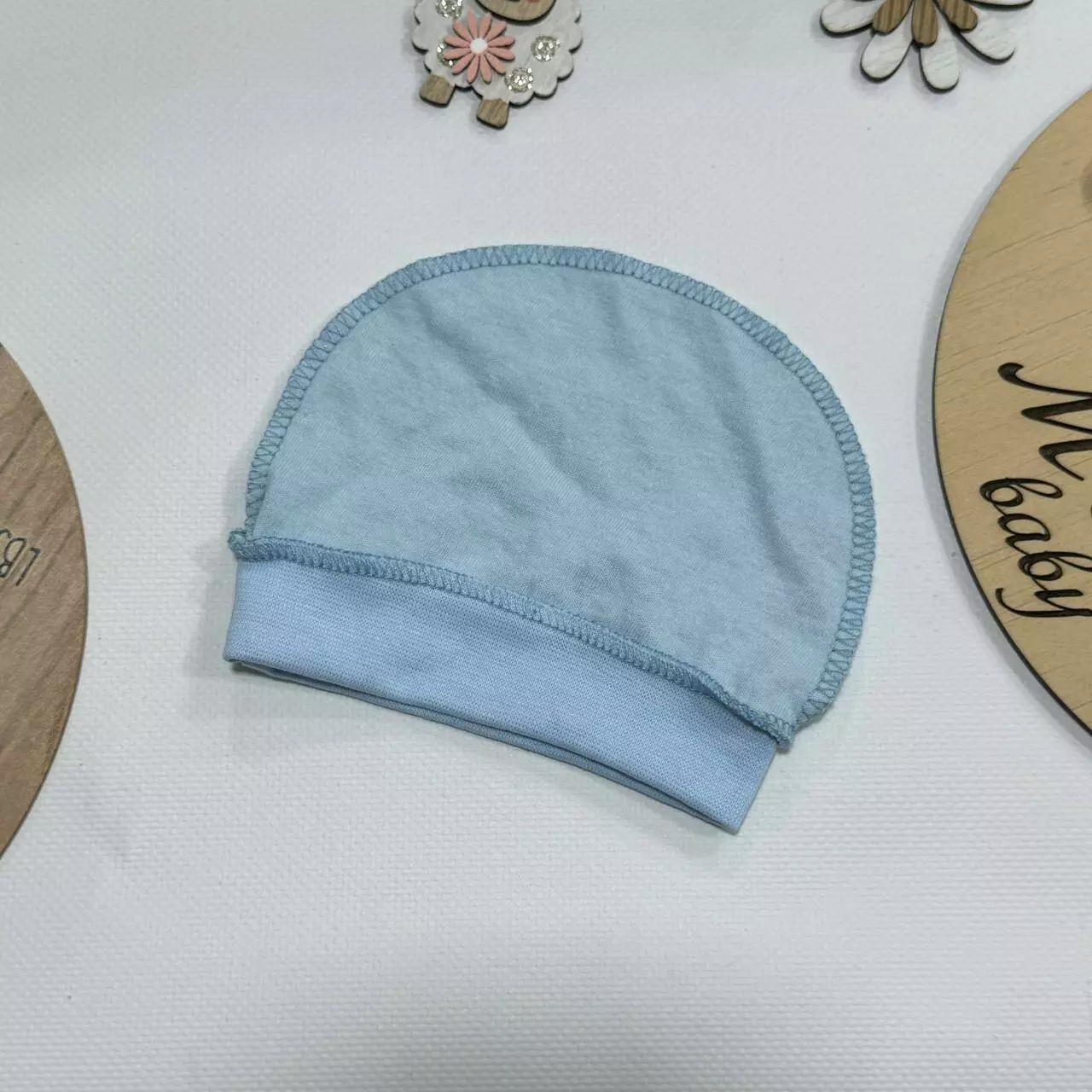Шапочка из кулира — обязательный элемент одежды для новорождённого.