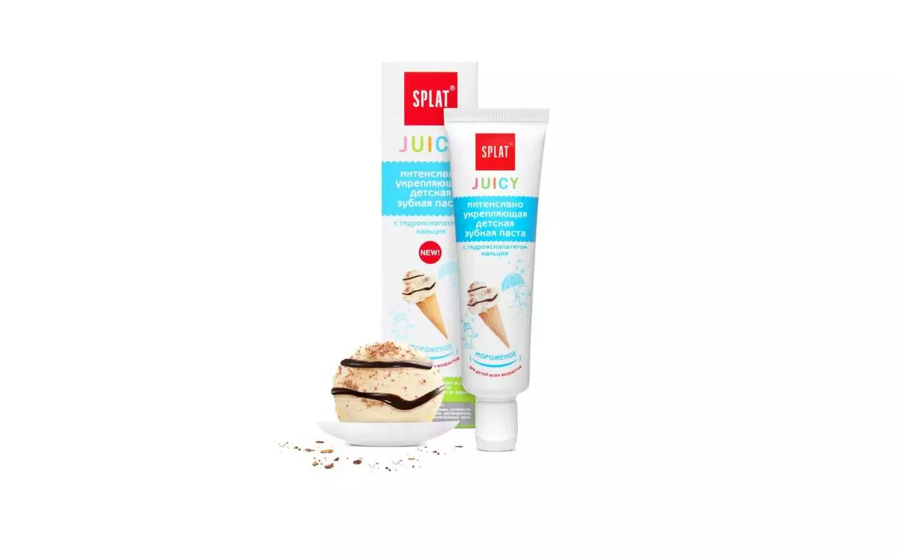 Интенсивно укрепляющая зубная паста Splat Juicy Мороженое с гидроксиапатитом кальция разработана специально для уязвимой детской эмали и защиты от кариеса.
