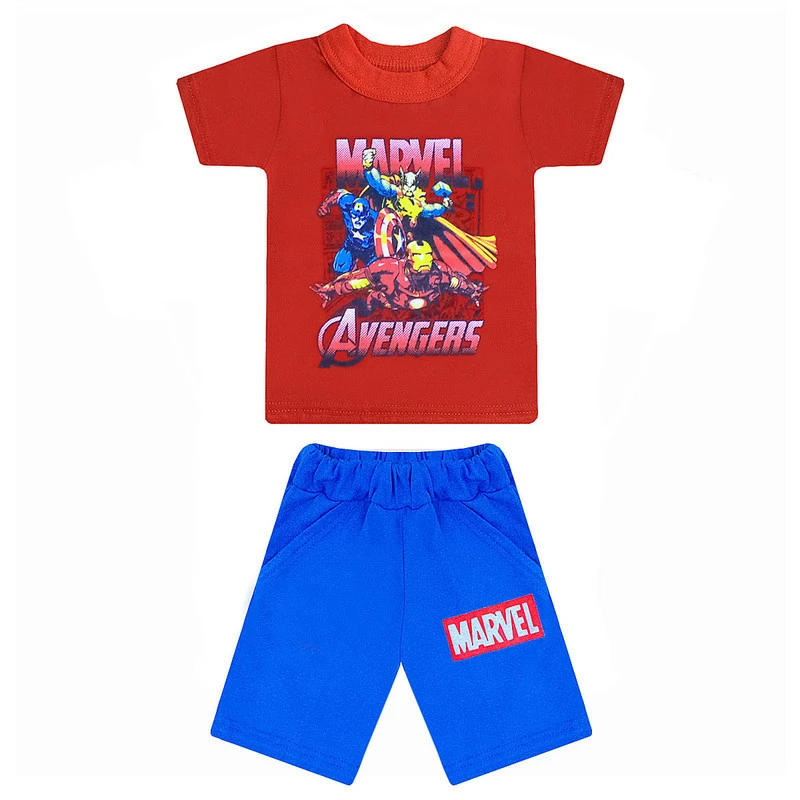 Детский костюм для мальчика состоит из яркой красной футболки,
