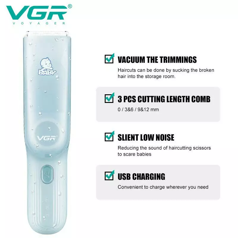 Дитяча машинка для стриження з функцією збору волосся VGR V-155 BLUE, 3 безпечні насадки, бесшумна, IPX8