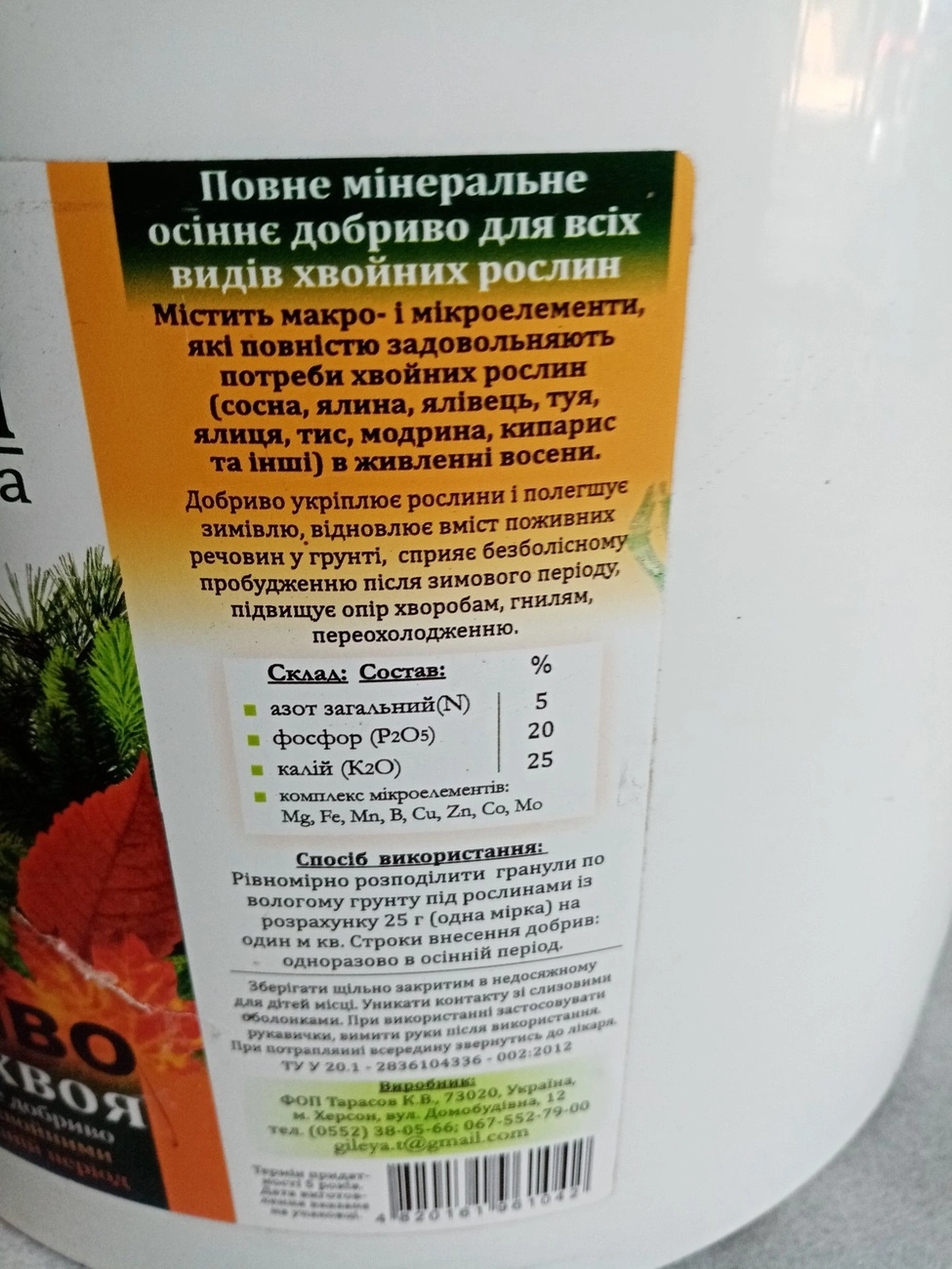 Макроелементи,%: азот загальний (N) -6, фосфор (P2 ПРО5) -25, калій