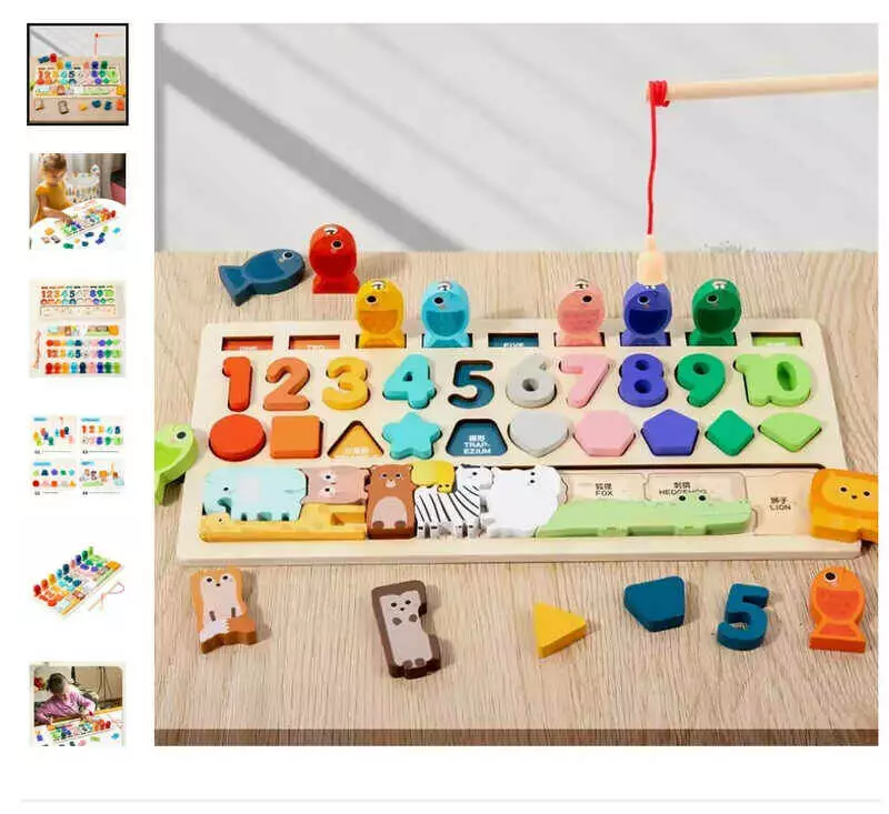 Логічна дерев’яна дошка C 73280 (60) магнітна риболовля, назви англ. мовою, цифри, геометричні фігури, сортер, мішечок, тваринки, пазл, в коробці