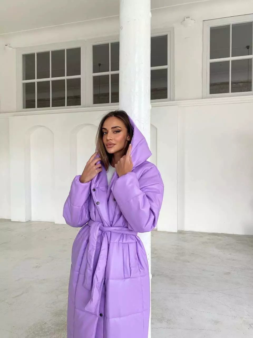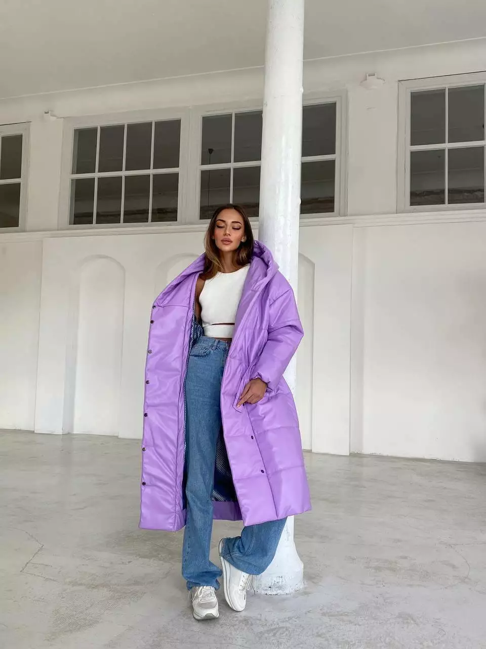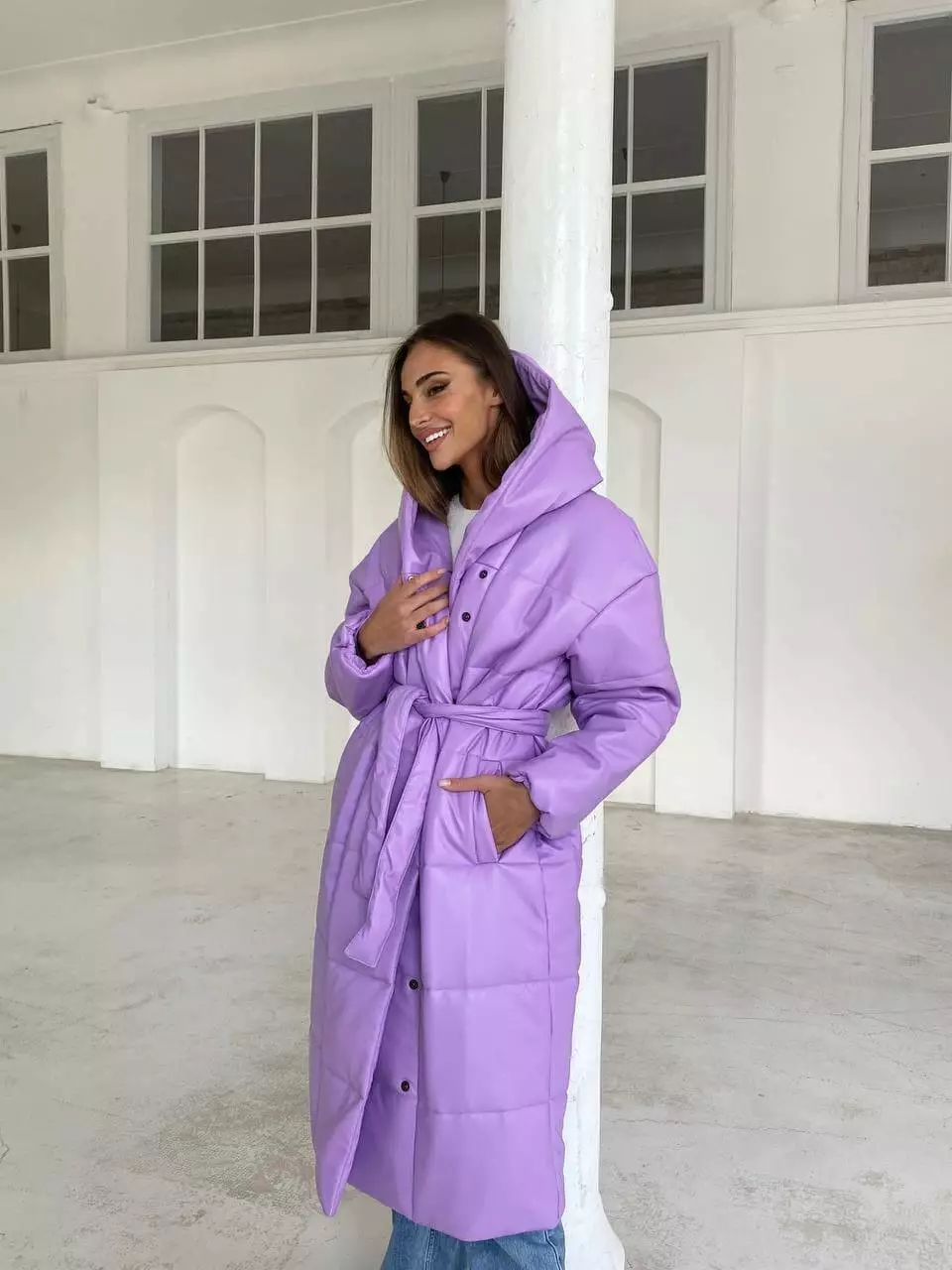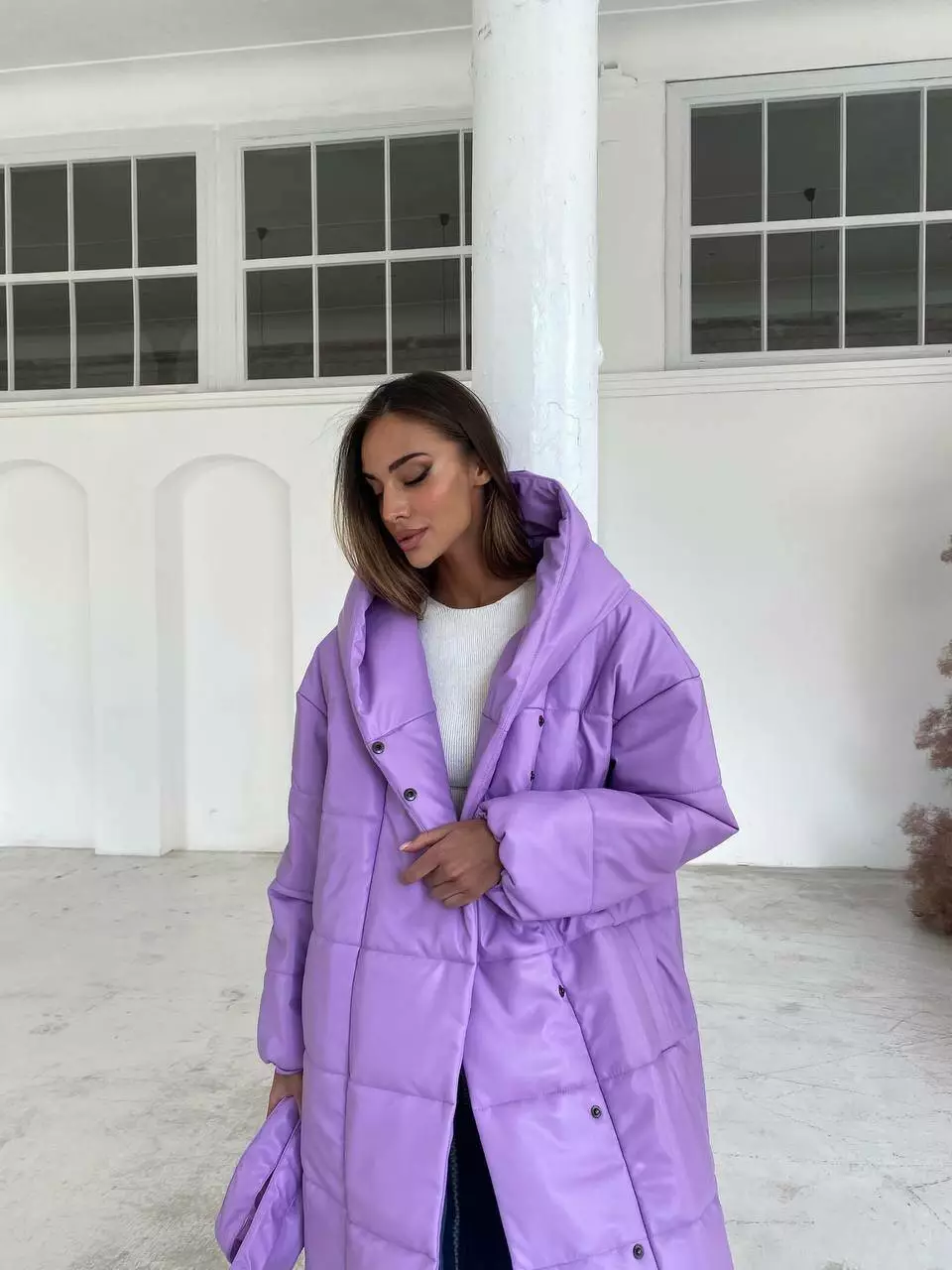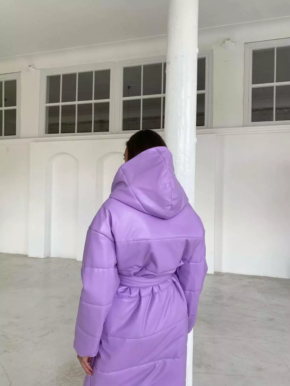 Довга жіноча зимова куртка - пуховик ZEFIR з екошкіри класу Lux на силіконі 200 з капюшоном колір лаванда