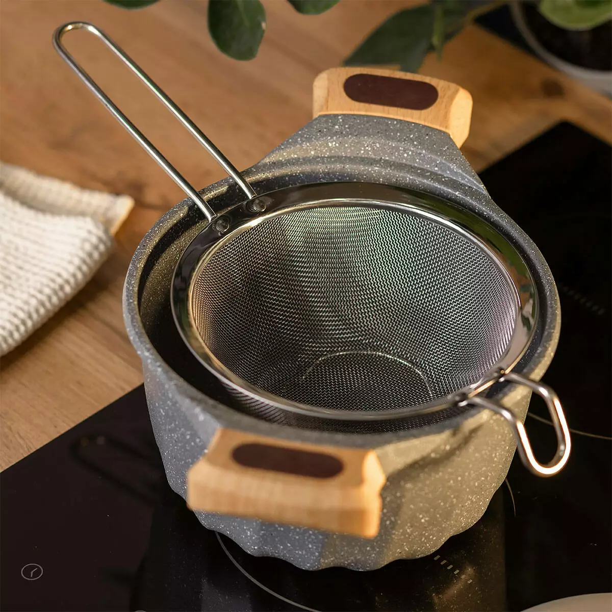 Завдяки зручній ручці довжиною в довжину друшляк-сито легко утримувати навіть під час роботи з гарячими рідинами. Діаметр 18 см дає змогу комфортно обробляти різні продукти, а глибина 8 см роблять процес використання максимально зручним. Оптимальна форма та сітчаста структура сприяють швидкому стіканню рідини без зайвих зусиль.