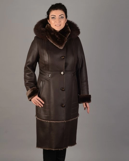 Женская искусственная дубленка на пуговицах, капюшон - съемный,