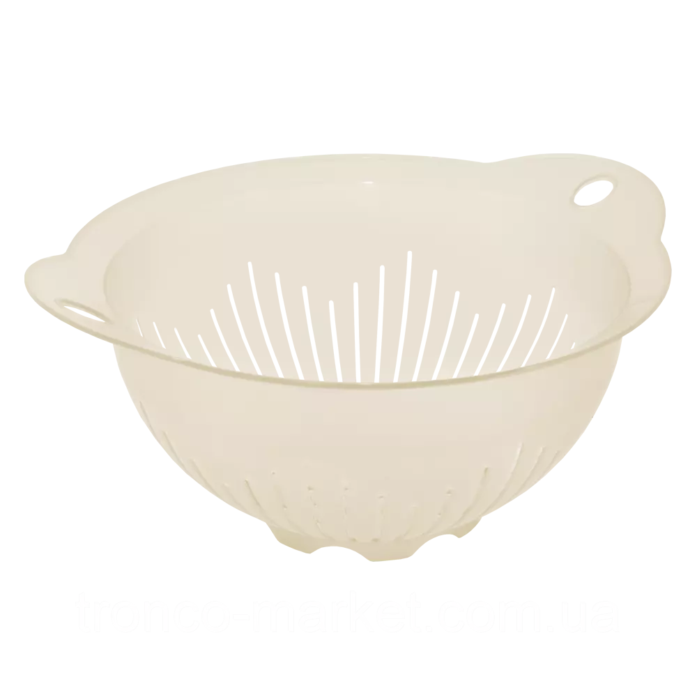 Дуршлаг пластиковый круглый. Имеет 2 ручки по бокам и ножки-подставки для устойчивости. Удобный, современный и практичный.