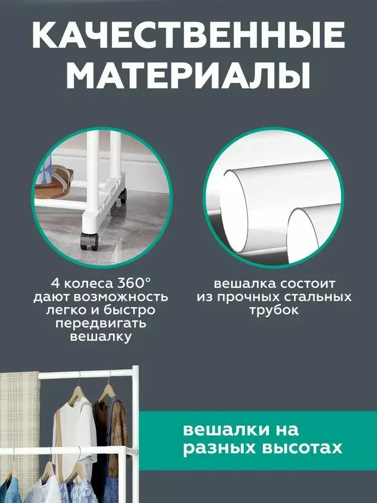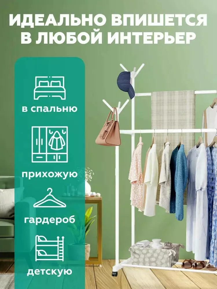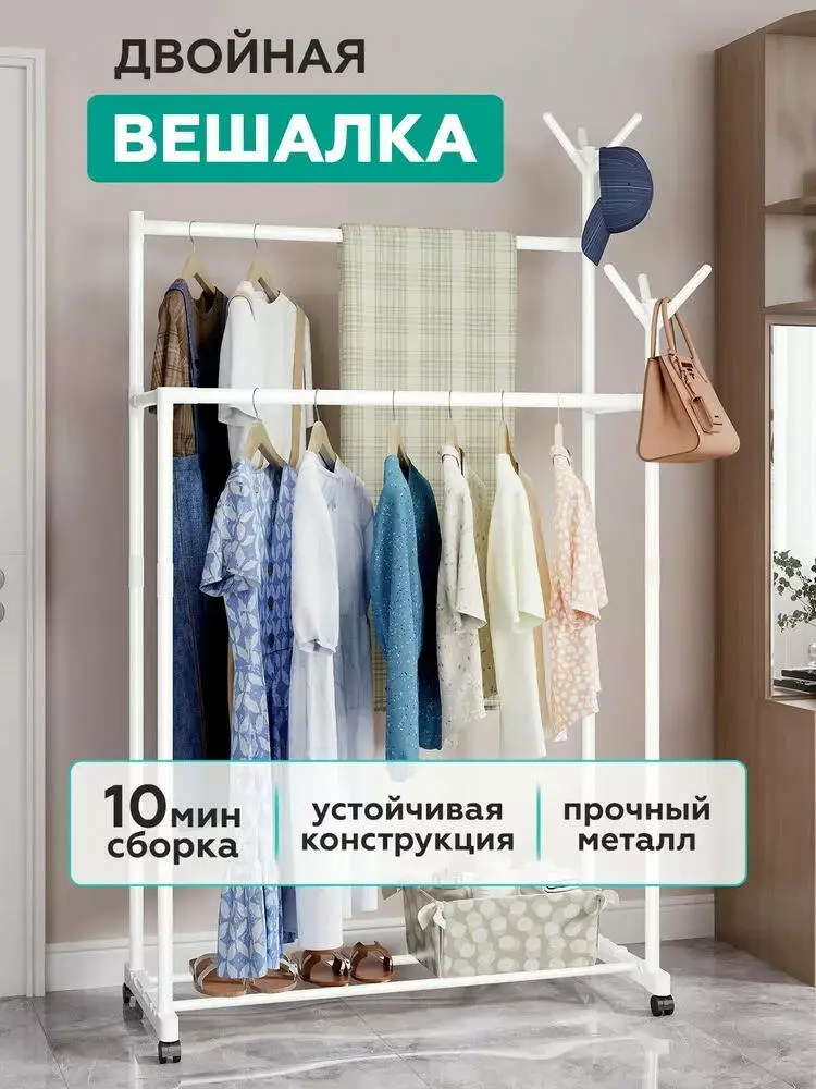 Расположение вещей в квартире, а особенно в квартире небольшого размера, дело непростое, есть всего несколько вариантов, при которых количество свободного места остается большим – это либо встроенный шкаф во всю стену, либо передвижной стойка для одежды. Представляем Вам удобный и выгодный способ размещения если не всех то необходимых вещей – универсальная стойка для одежды. Большим плюсом стойки для одежды является наличие небольших колесиков, благодаря которым Вы сможете передвинуть стойку даже полностью завешенной одеждой. Преимущества стойки для одежды Double Pole Clother Hose: Достаточно габаритная, для размещения большего количества одежды Компактная, глубина, для сохранения пространства Имеет легкий вес Легкая и довольно быстрая уборка Не требует использования дополнительных инструментов (только руки) Благодаря колесикам легко транспортируется даже загруженной. Двойная стойка Поперечные небольшие перекладины